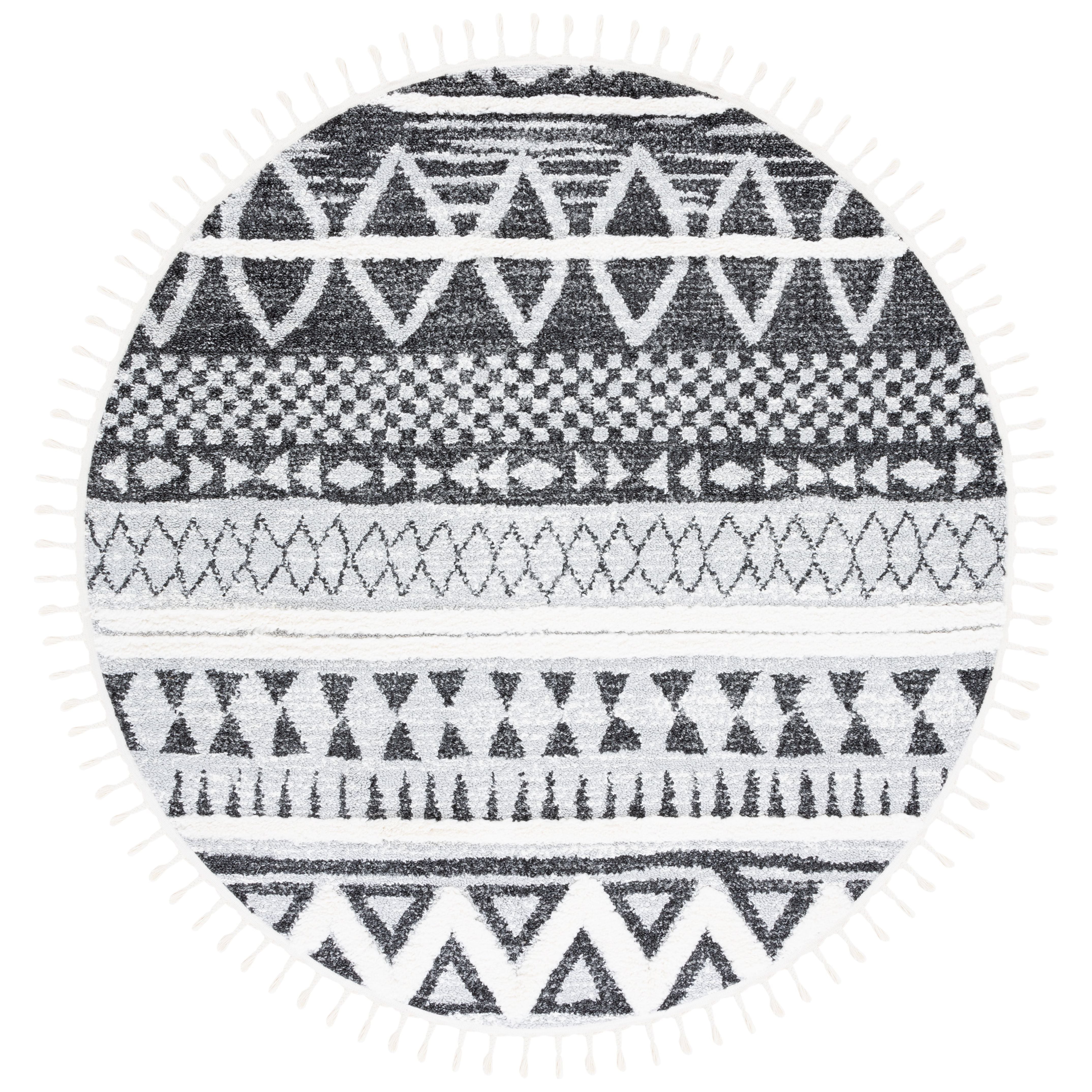 Elevate your living space with the exquisite Moroccan Tassel Shag MTS634F rug from SAFAVIEH. Embrace the allure of Old World charm with its captivating diamond designs and luxurious textures, perfect for adding a touch of rustic-chic elegance to any room. The braided fringe detail lends a whimsical vibe, making it a must-have statement piece. Crafted using high-quality synthetic yarns, these shag rugs promise durability and softness for years to come, with an approximate thickness of 1.54 inches.