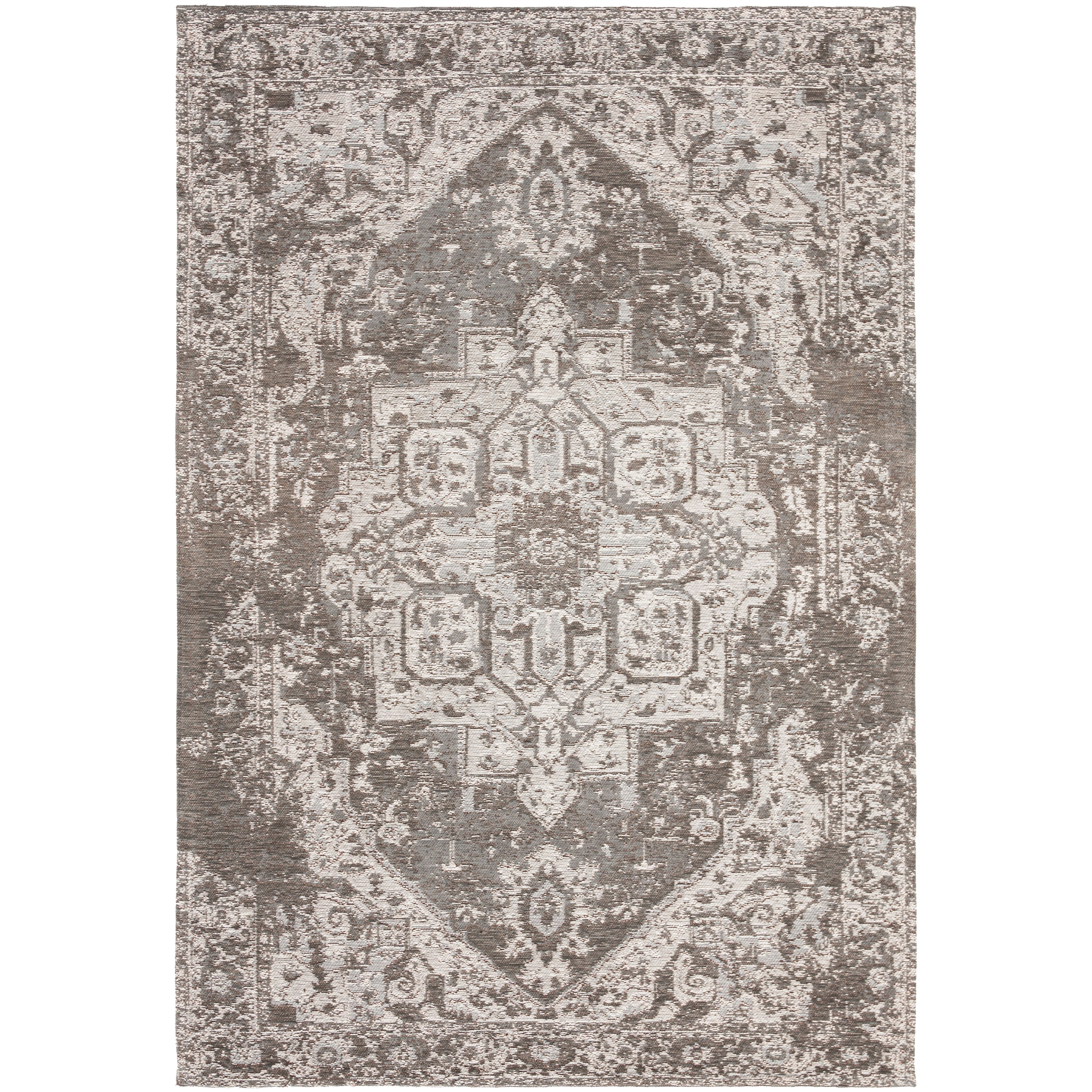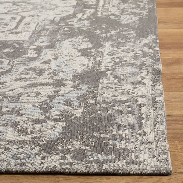 CLV Classic Vintage CLV111F Grey rug, a stylish addition to any home decor. Inspired by the trend of repurposing old carpets, Safavieh's Vintage Collection offers a fresh take on vintage aesthetics. Crafted in Belgium, each rug is power-loomed using 100% organic viscose yarn for a luxurious feel underfoot. The low cut pile meticulously reproduces the worn look of antique carpets, while intentionally uneven dyeing adds a touch of old-world charm to classic Persian and Turkish motifs.