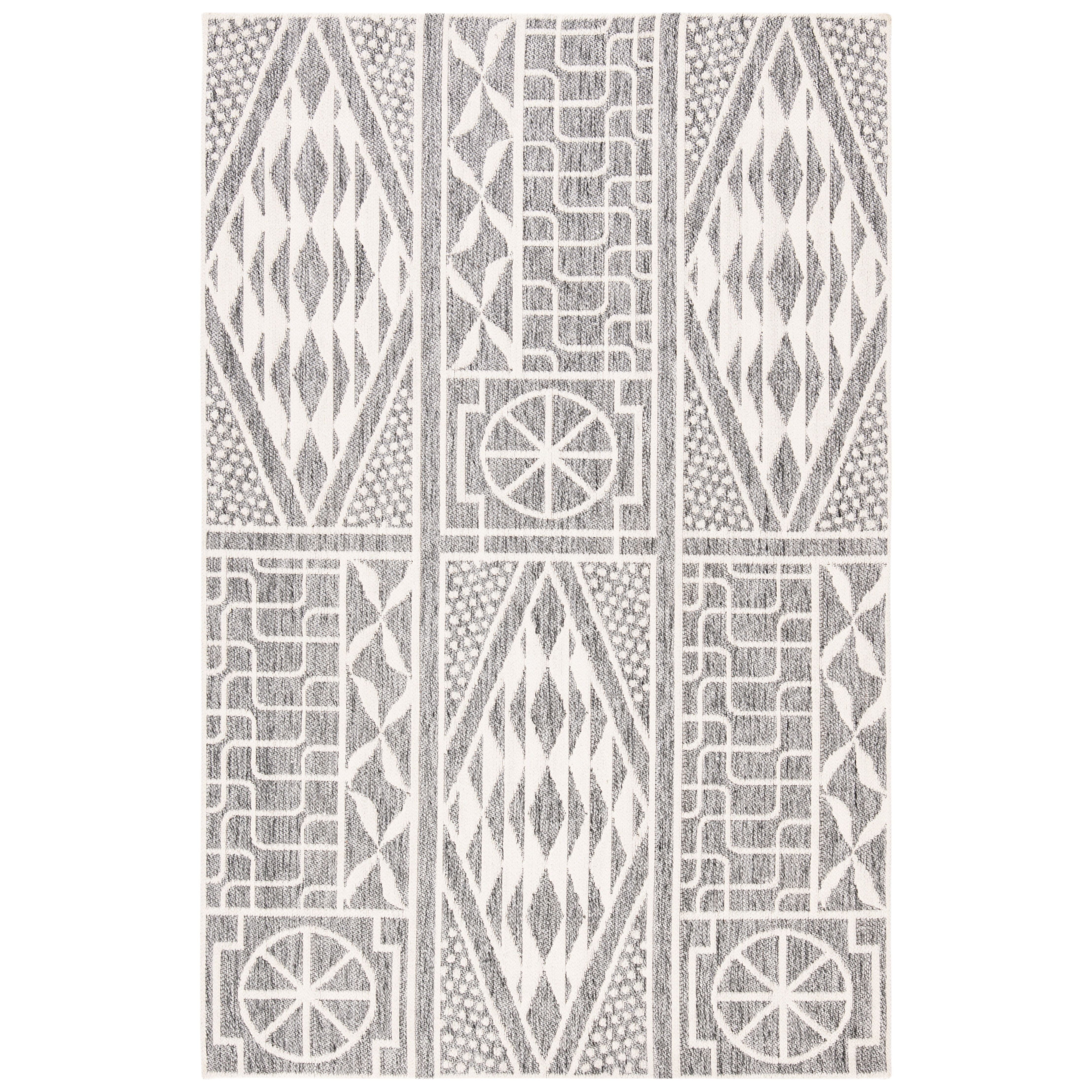Marbella MRB609F Grey Ivory rug from Safavieh. This collection pays homage to New England's talented fiber artists, showcasing exquisite craftsmanship in each piece. Hand-tufted in India, these cotton pile rugs capture the essence of fine art using a blend of fabric, yarn, and natural fibers. The Marbella MRB609F boasts vibrant colors that align with modern palettes, ensuring a trendy touch to any space.