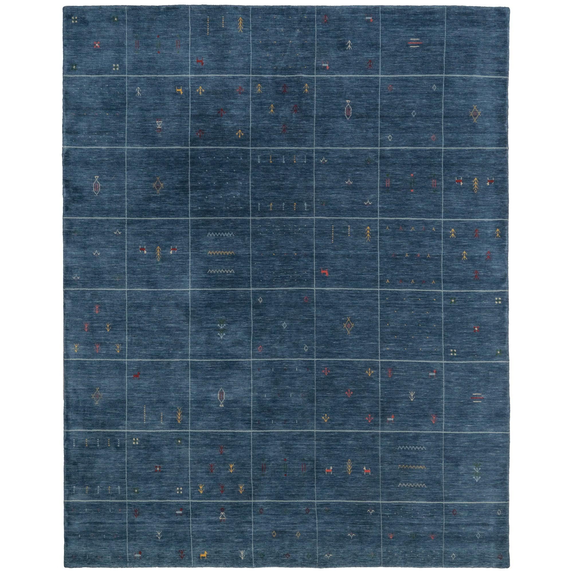 Introducing our exquisite Kerman Lapis rug, a true embodiment of traditional Gabbeh craftsmanship. This timeless piece features minimal patterning adorned with simple stylized figures and shapes that narrate the artisan's daily life. Crafted with precision, the design evokes a sense of elegance and charm that will elevate any room it graces.