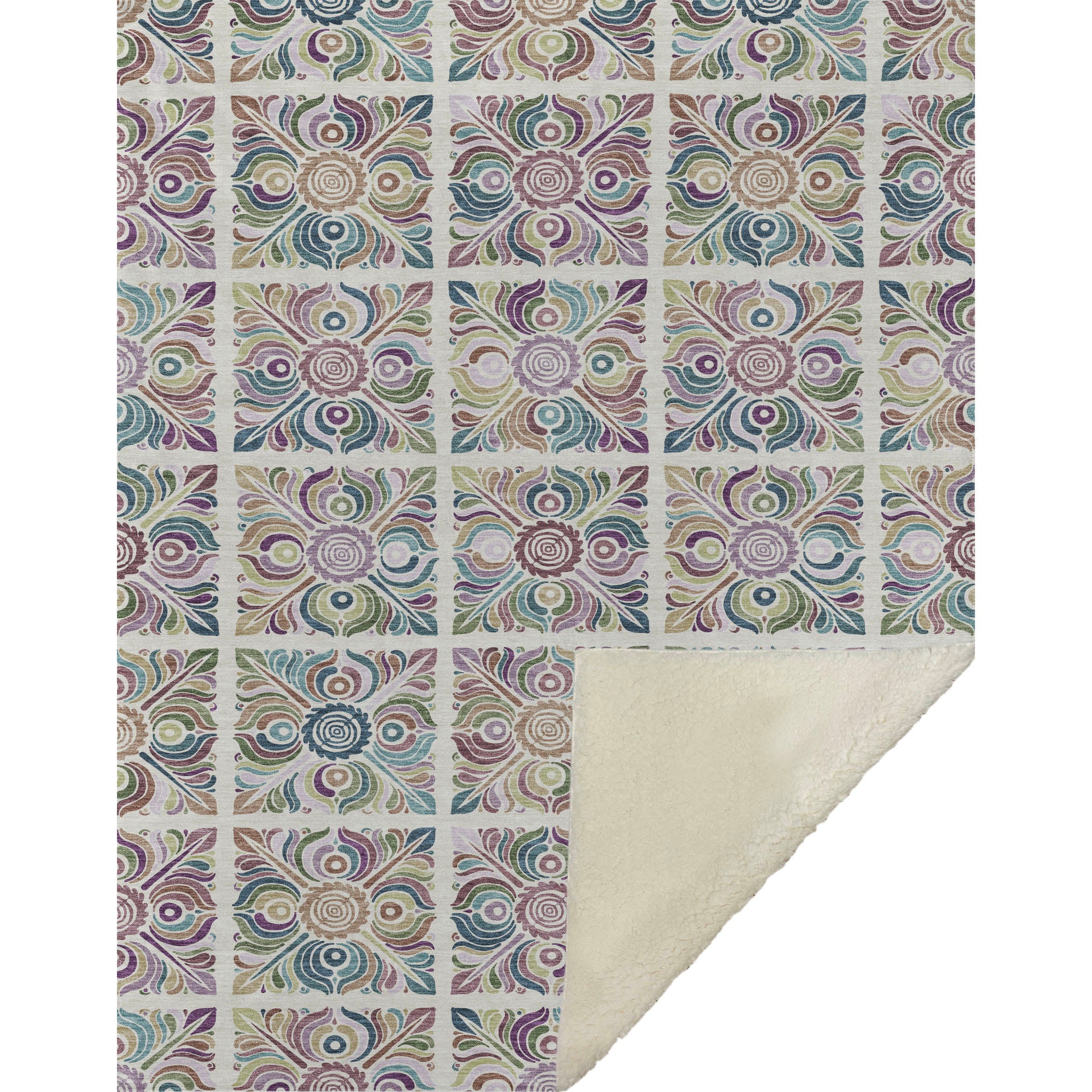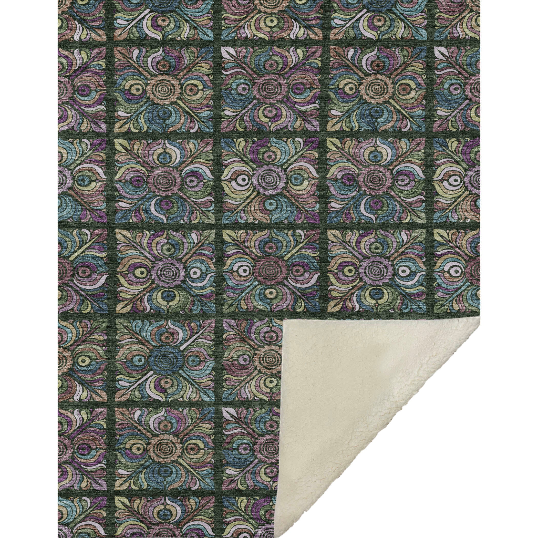 Immerse yourself in the intricate beauty of a transitional style that bridges past and present with stained glass squares and captivating medallions. The oversized dimensions of 50" x 70" provide ample coverage, featuring a luxuriously soft-touch front and warm sherpa backing for ultimate comfort. Crafted from fade-resistant polyester microfiber, it’s ideal for indoor or covered outdoor use, while the Premium Machine Washable feature ensures simple care.