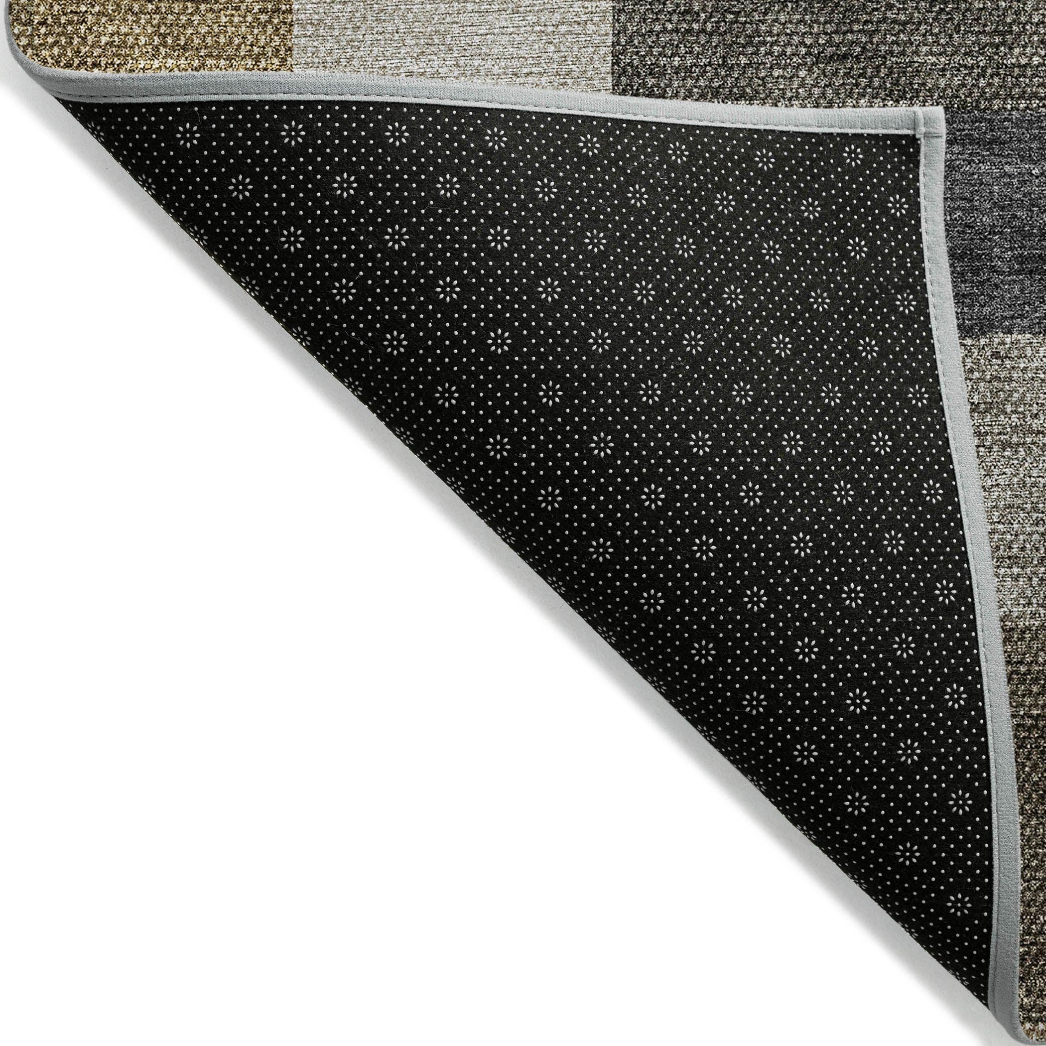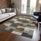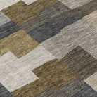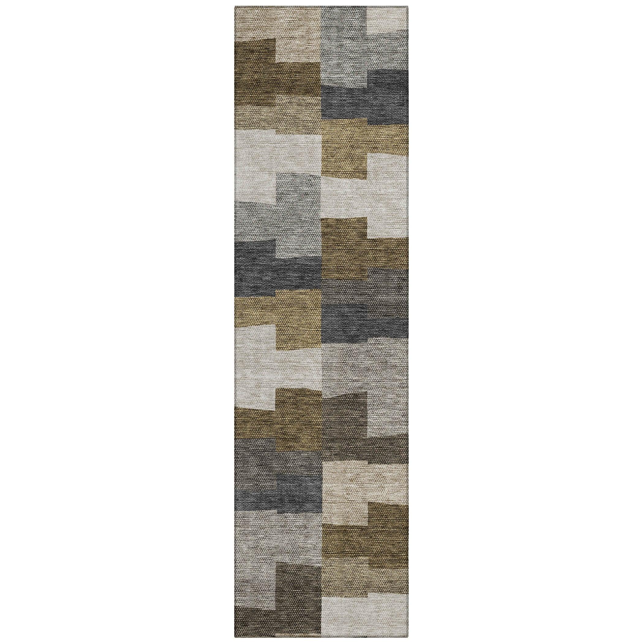 Chantille ACN659 Brown area rug, a stylish addition to any home decor. This modern piece features irregular block shapes arranged in horizontal lines, blending transitional and geometric design elements seamlessly. The rug is UV-stabilized, making it suitable for both indoor and outdoor use, providing versatility for any space.