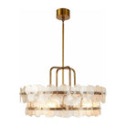 Inspired by the natural flow of water, clear seedy glass florets layer and overlap like a luxe puzzle. Anchored to a double drum frame of antique brass steel, their glow is refracted and reflected to deliver the feeling of movement.
