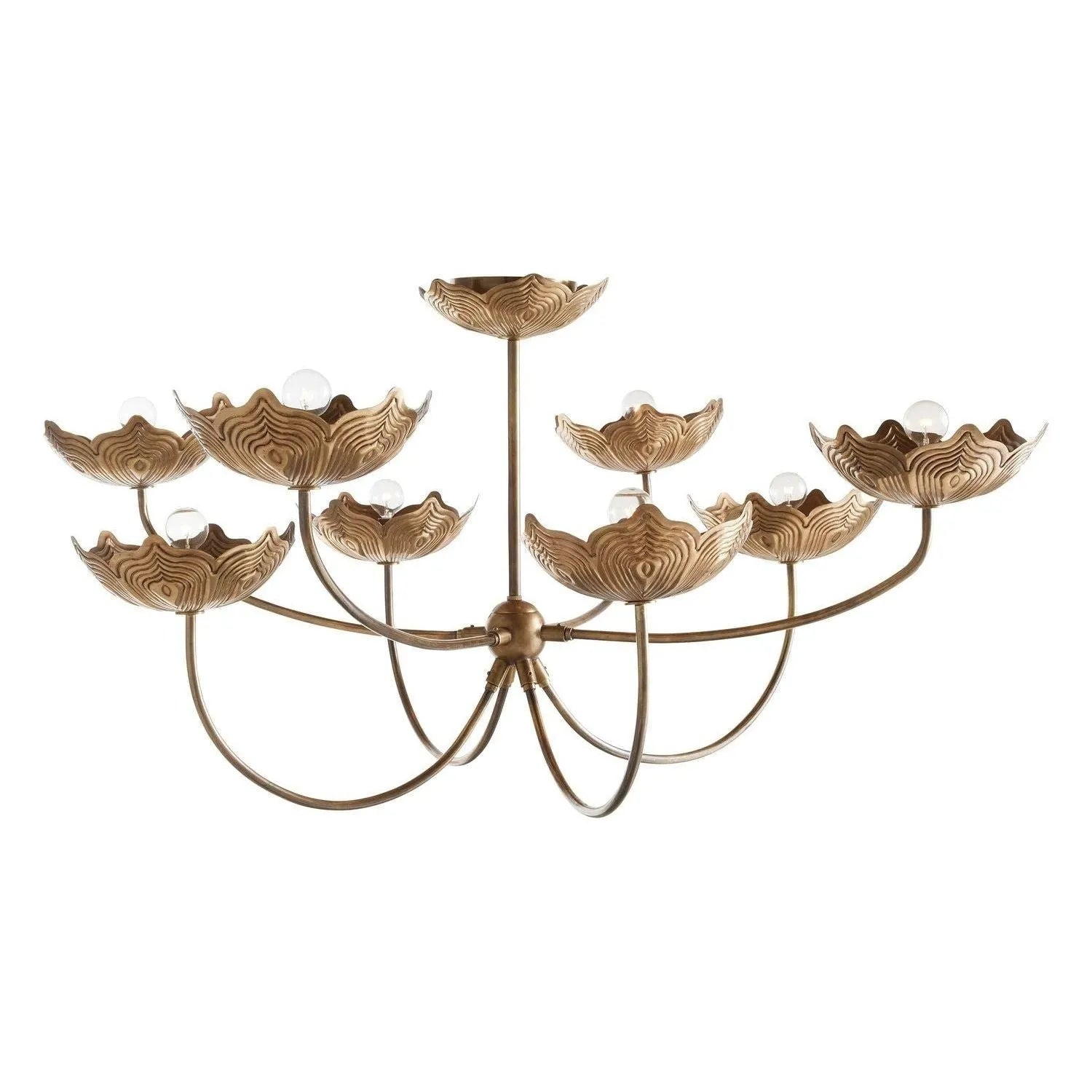 A modern take on Art Nouveau, this multi-level style features lush layers gathered in a single bouquet. Reminiscent of flowers blooming in a field, each hand-formed shade of antique brass is intricately detailed, then balanced on a delicate iron armature, facing upwards for a flattering diffused effect. Finish will vary.