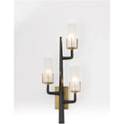 A torch for the new age the Griffin Sconce is a unique option for true design enthusiasts seeking something with flair. Frosted glass shades diffuse the light creating a soft glow that contrasts the sharp angles and bronze finish with antique brass details. Shown with a clear globe bulb. Approved for use in covered outdoor areas.