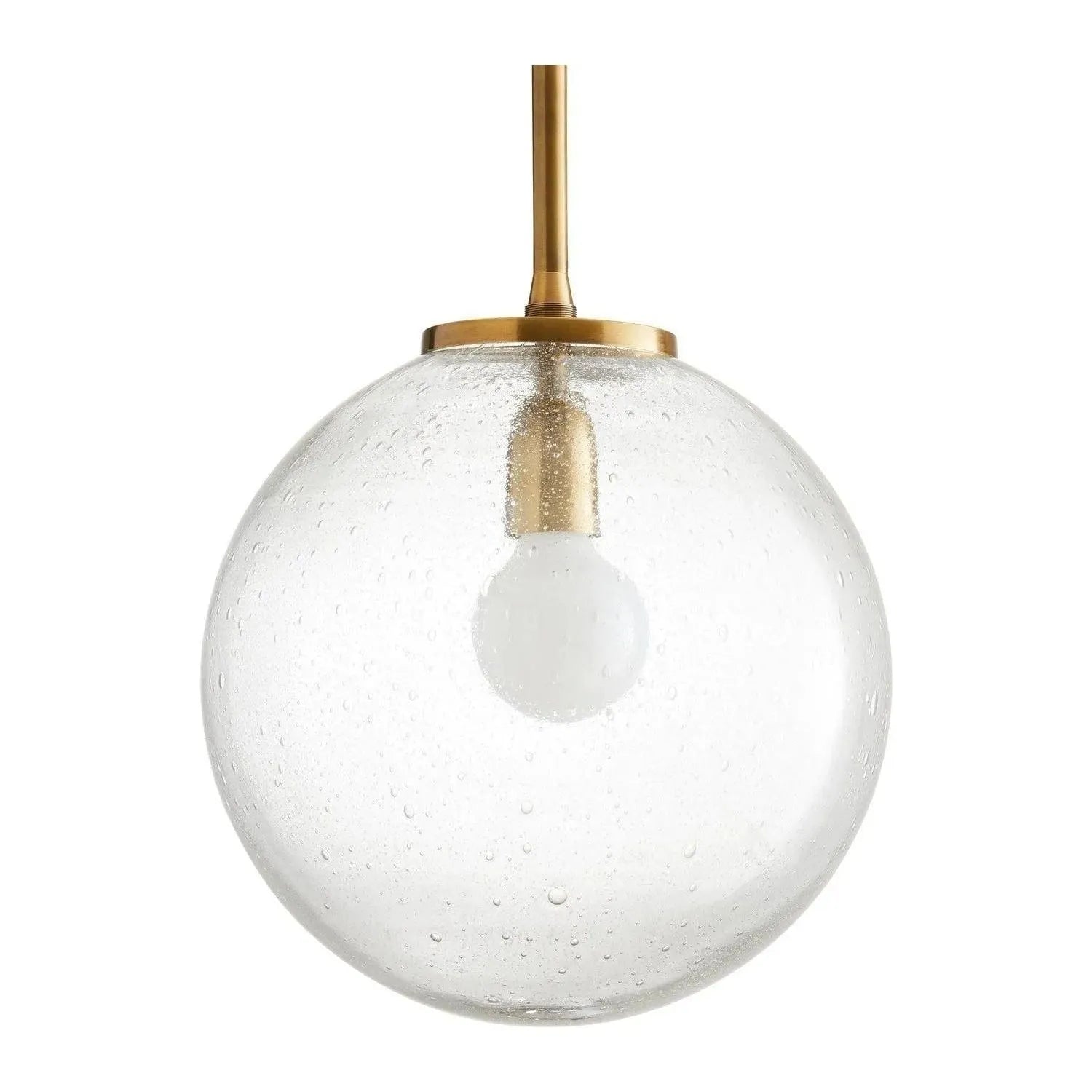 Clear seedy glass has been blown by hand to create the perfectly spherical shade that defines the Izzy Pendant. An antique brass pipe and matching canopy elevate this piece from simple to stunning. The bulb is centered in the shade, allowing every textured detail to shine. We see this pendant styled in multiples above a kitchen island in modern or traditional settings. Finish will vary. Additional pipe available (PIPE-239). Damp rated, though limited outdoor conditions may affect finish.