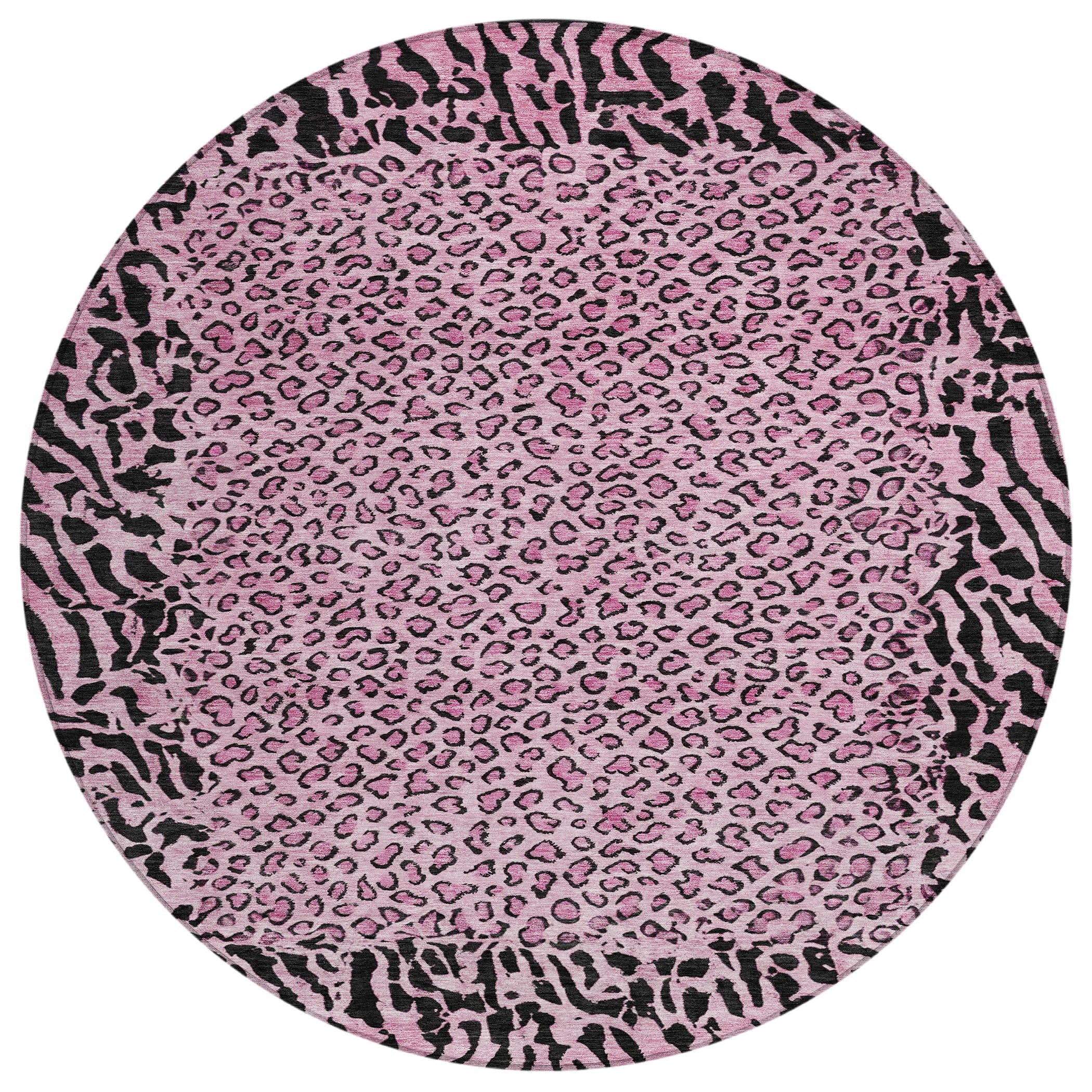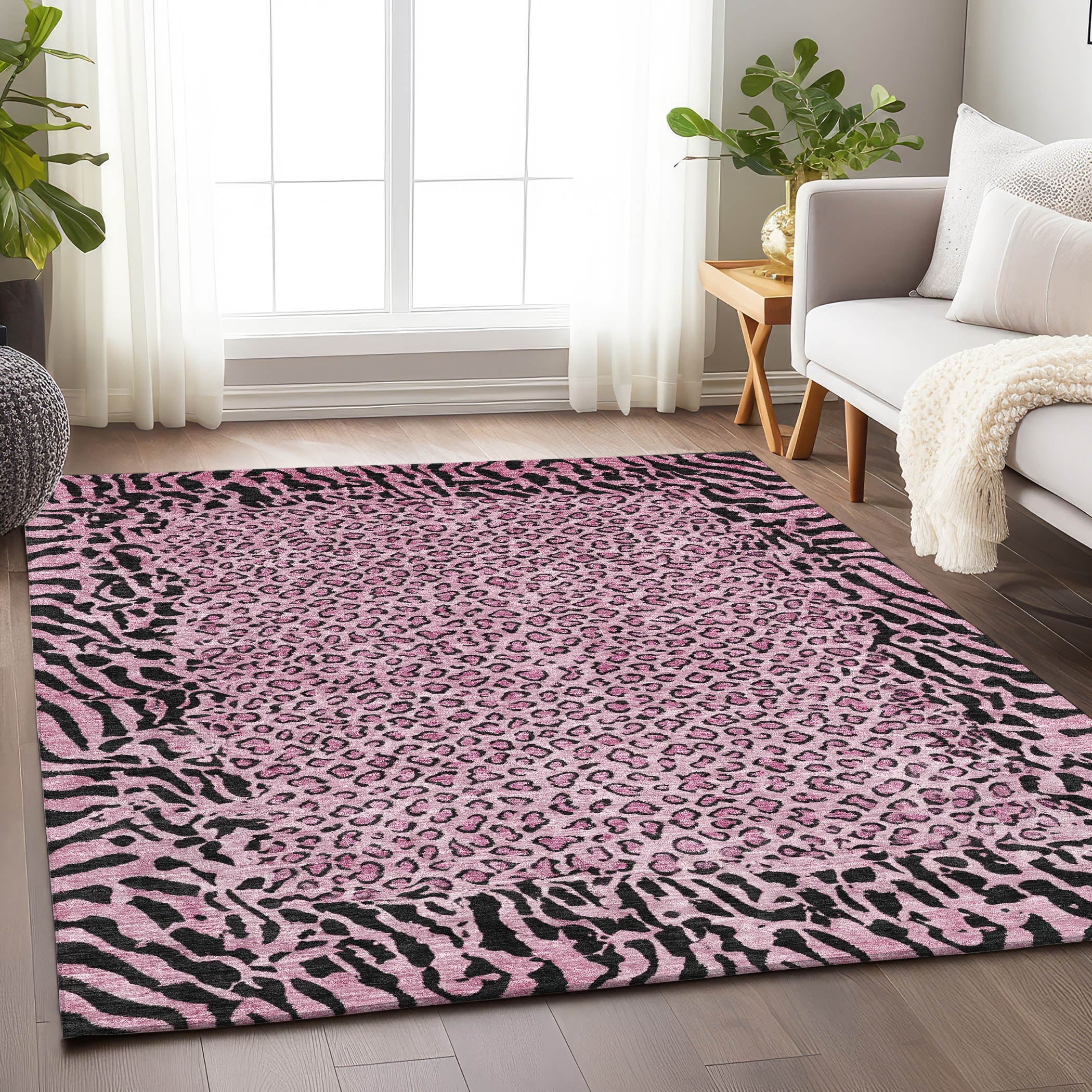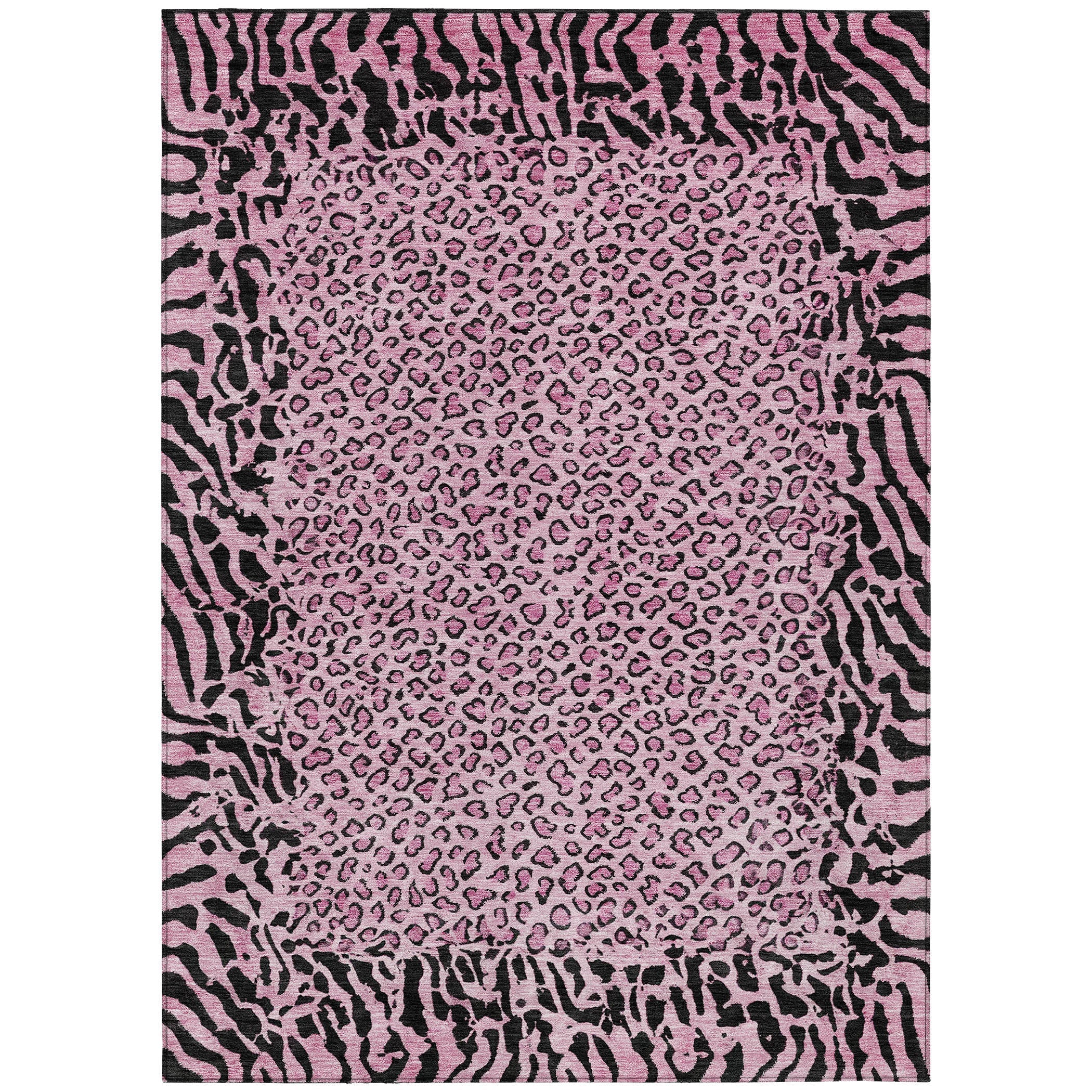 Featuring a zebra border and a modern cheetah print field, this area rug brings an eye-catching element to transitional settings. The animal skin pattern adds a wild and stylish touch. UV stabilized for indoor and outdoor use, its ultra-thin construction makes it easy to clean. Machine-washable and family and pet-friendly, it’s built for everyday convenience.