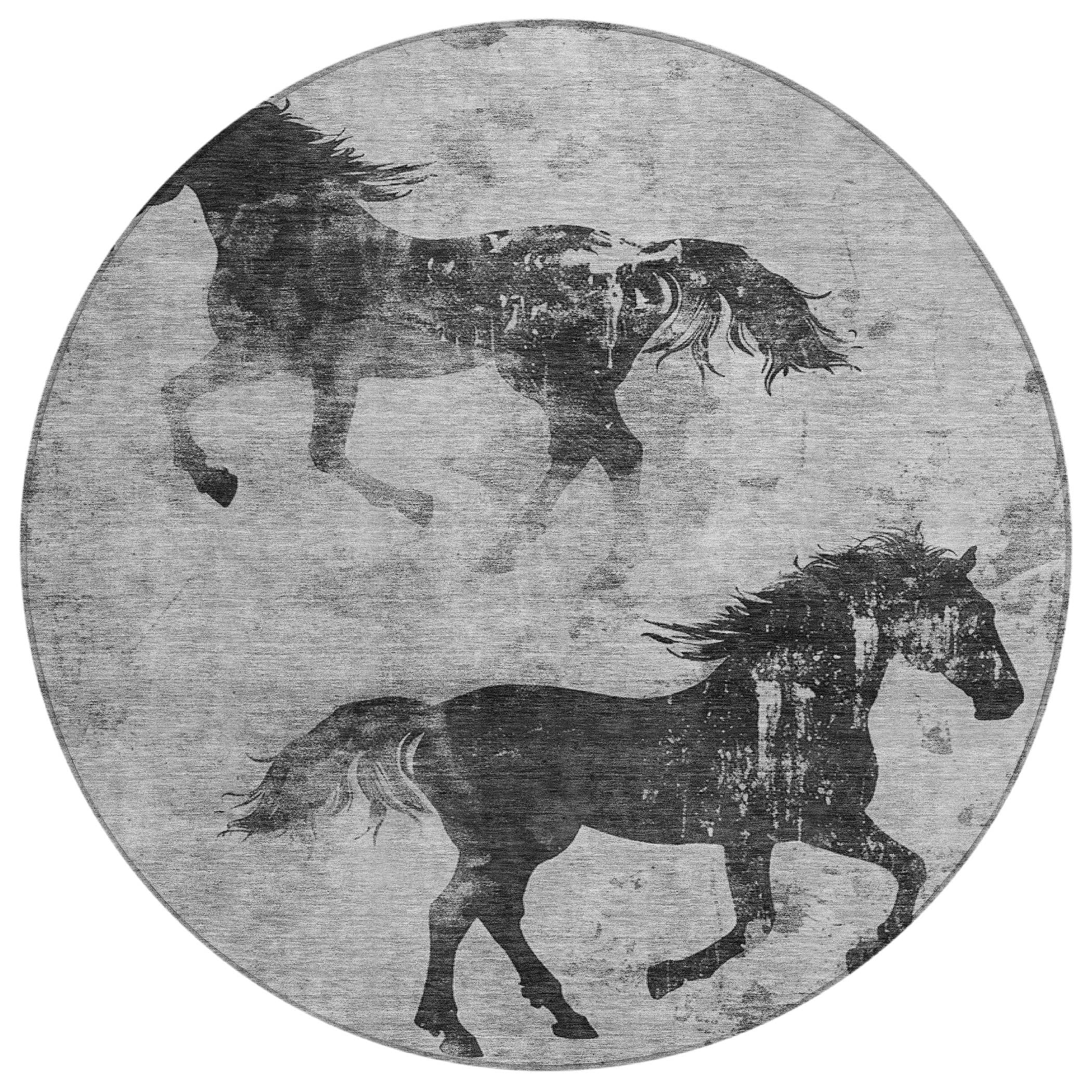 With two elegant horses depicted in a distressed pattern, this rug brings a classic yet transitional style to any space. The detailed design captures the beauty of the horses in a weathered look, perfect for modern settings. Its sturdy construction and simple upkeep make it an ideal addition to both style and function.