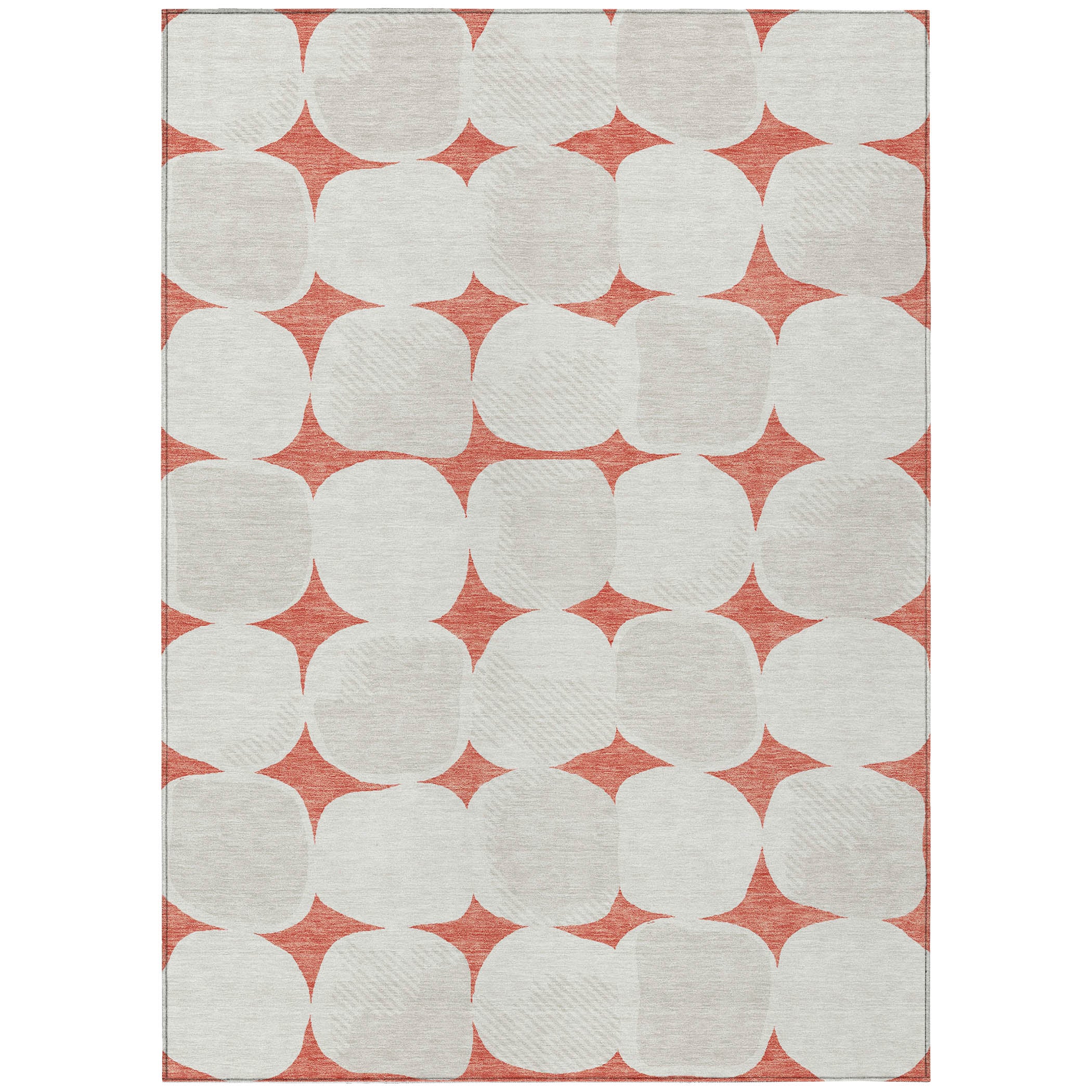 Elevate the ambiance of your home with the stunning Chantille ACN870 Salmon area rug. Its captivating design showcases large stone-shaped circles arranged in a seamless pattern, bringing a sense of tranquility and sophistication to any room. The circular motif exudes an air of grace and refinement, enhancing your decor effortlessly.
