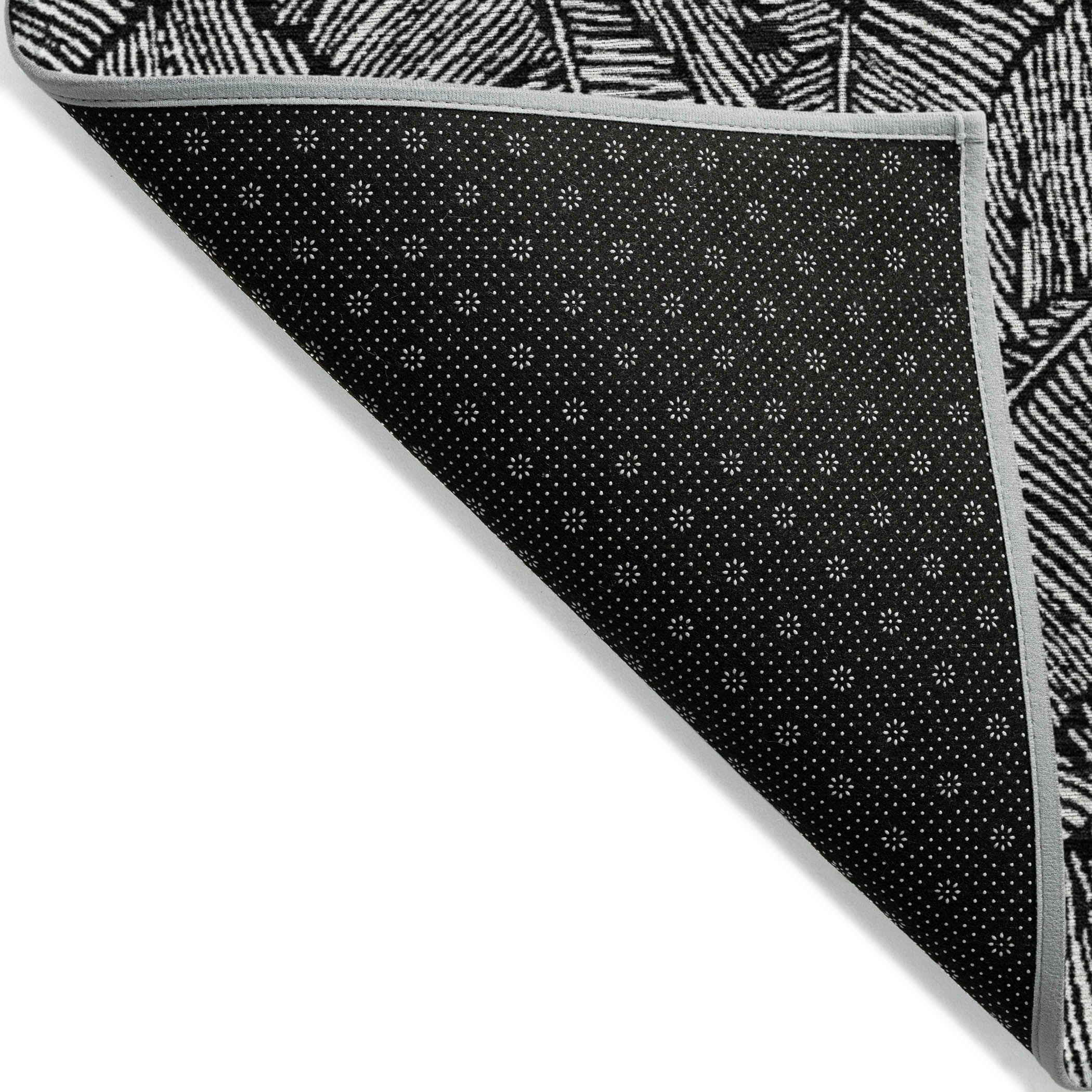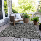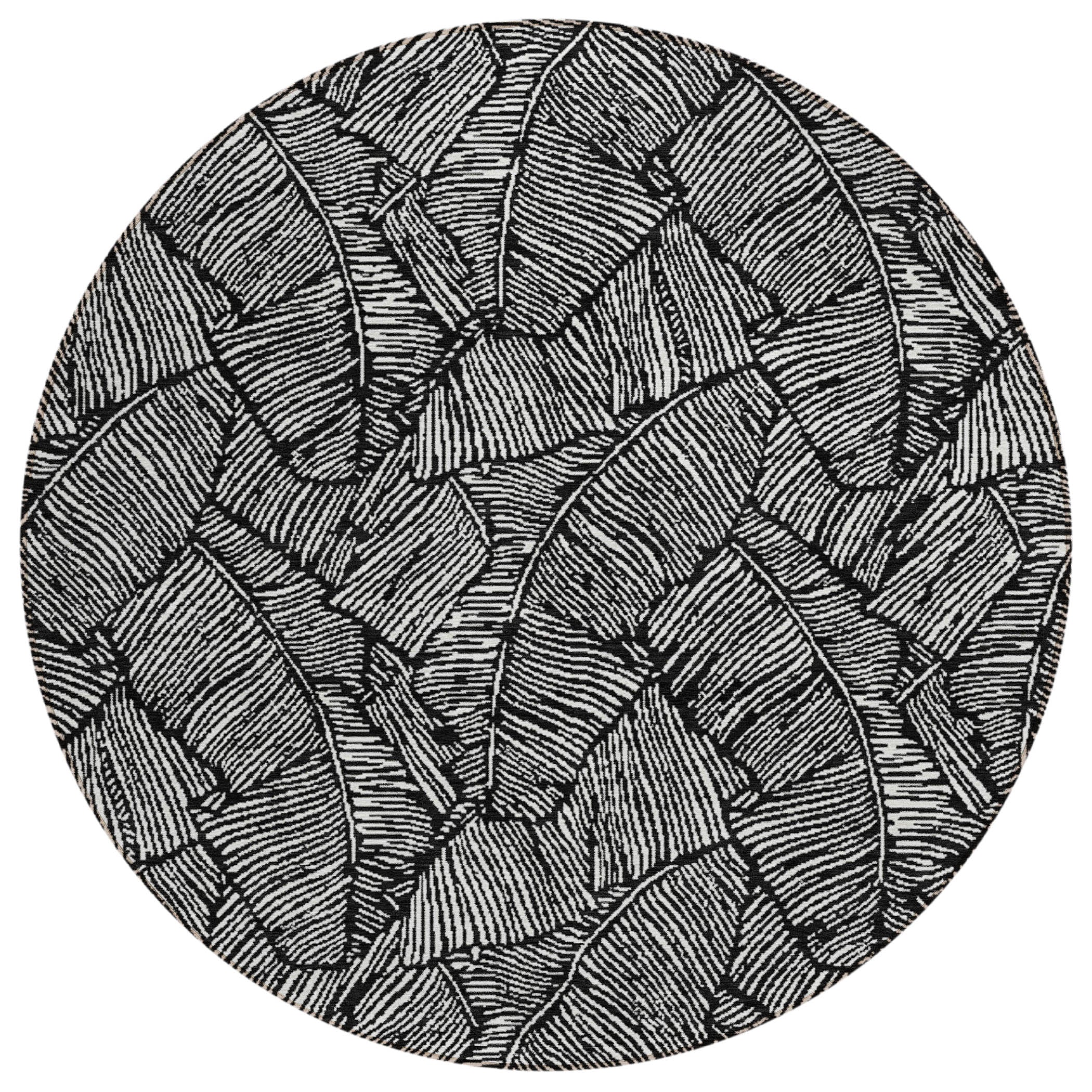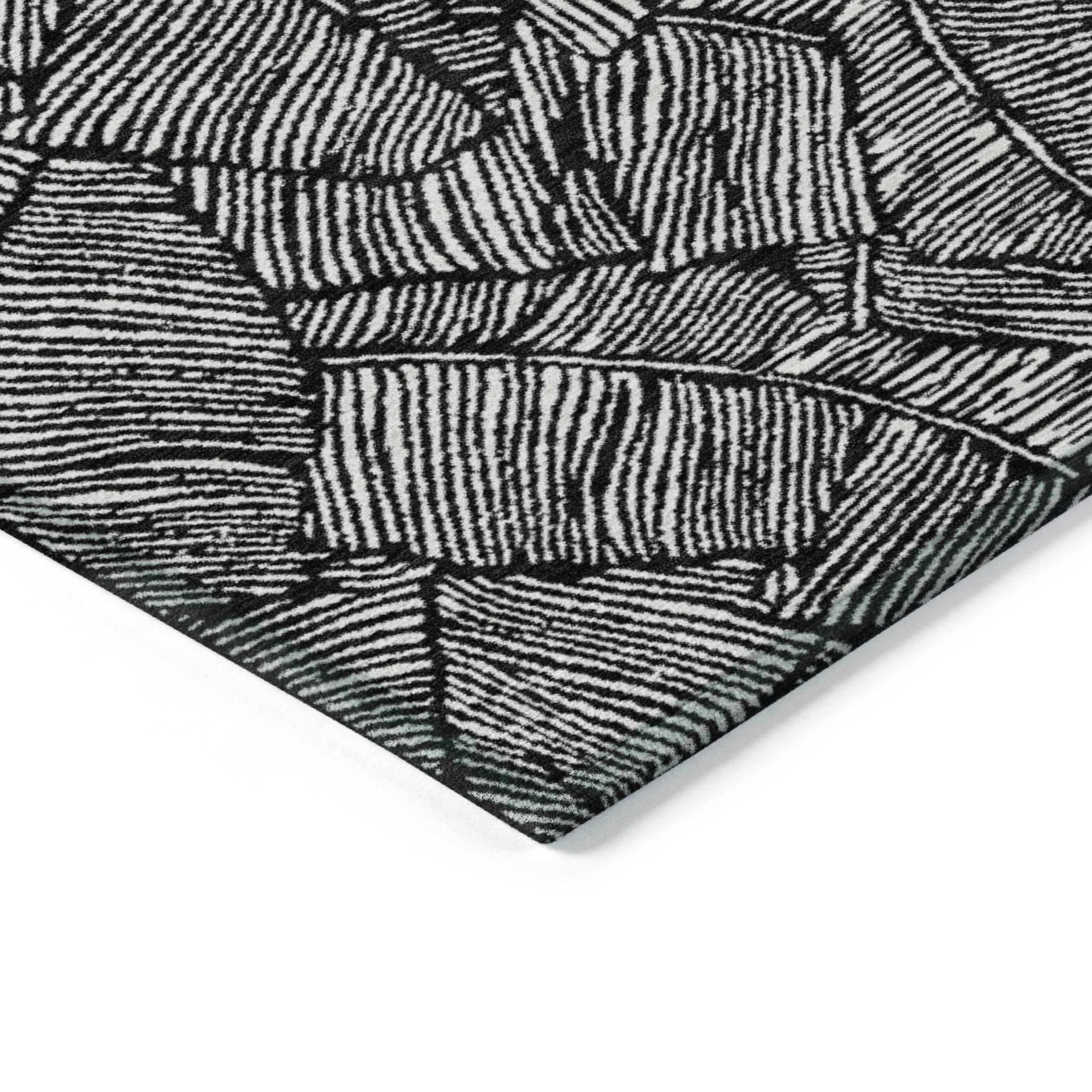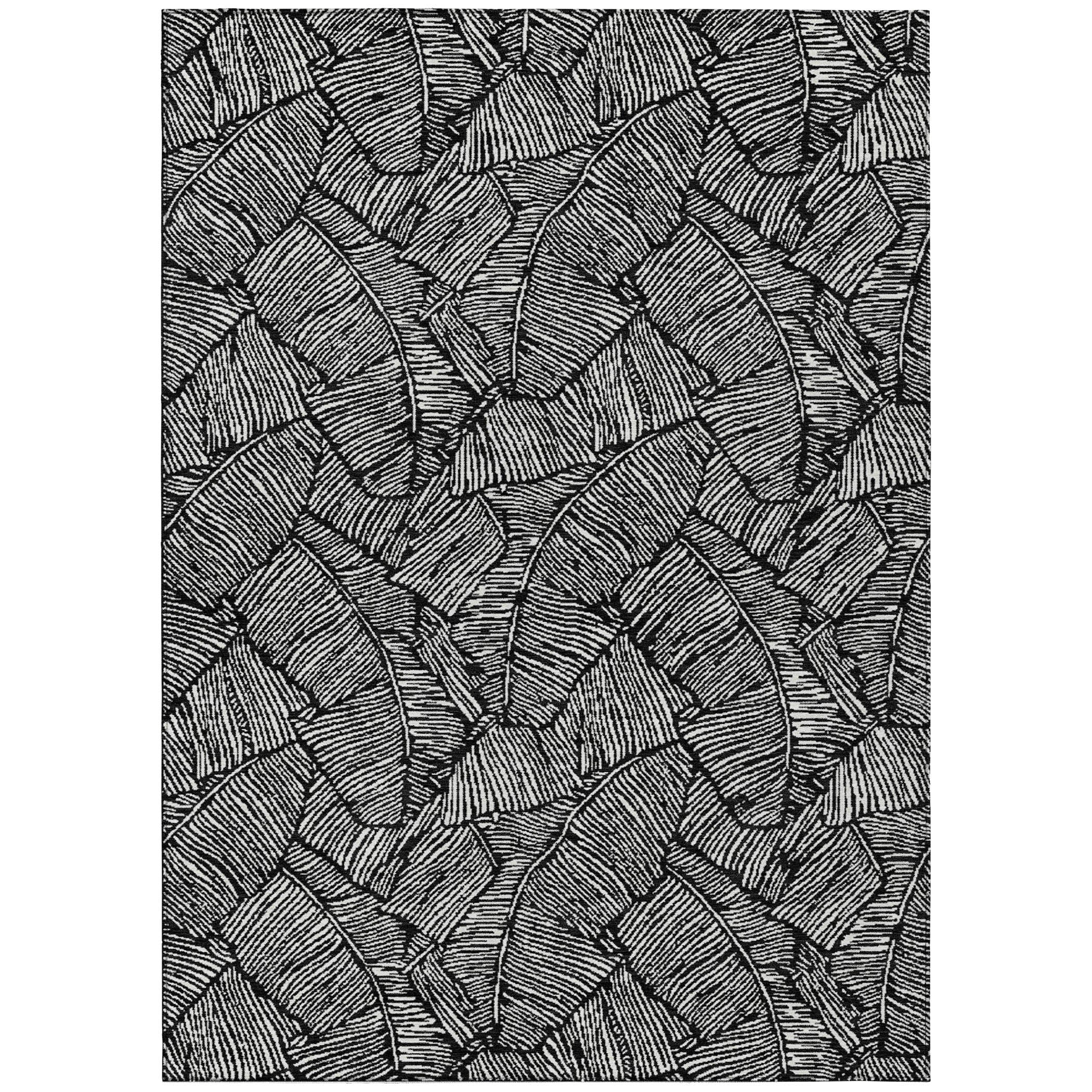 Chantille ACN913 Black area rug - a stunning piece that effortlessly merges transitional style with a floral touch. Its striking large-scaled leaves and sleek monotone color palette make it a versatile addition to any space. Designed for both indoor and outdoor use, this rug is UV stabilized for long-lasting vibrancy. The ultra-thin construction makes it easy to place in various areas of your home, while its machine-washable feature ensures convenient maintenance.