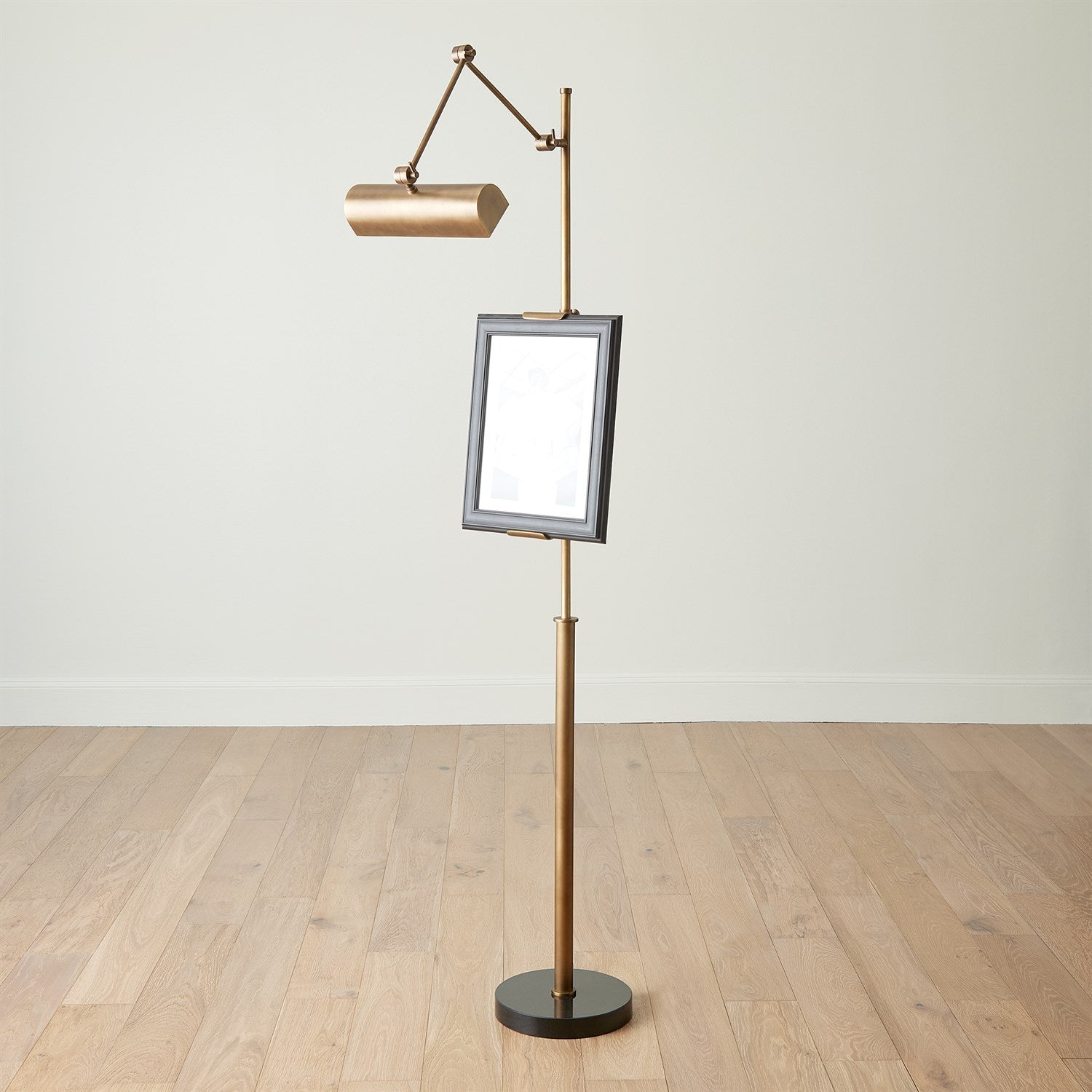 The Display Floor Lamp is designed to beautifully illuminate and showcase your favorite artwork or portrait. Handcrafted from brass with an Italian antique finish, it features a striking black granite base, combining elegance with functionality in any space.