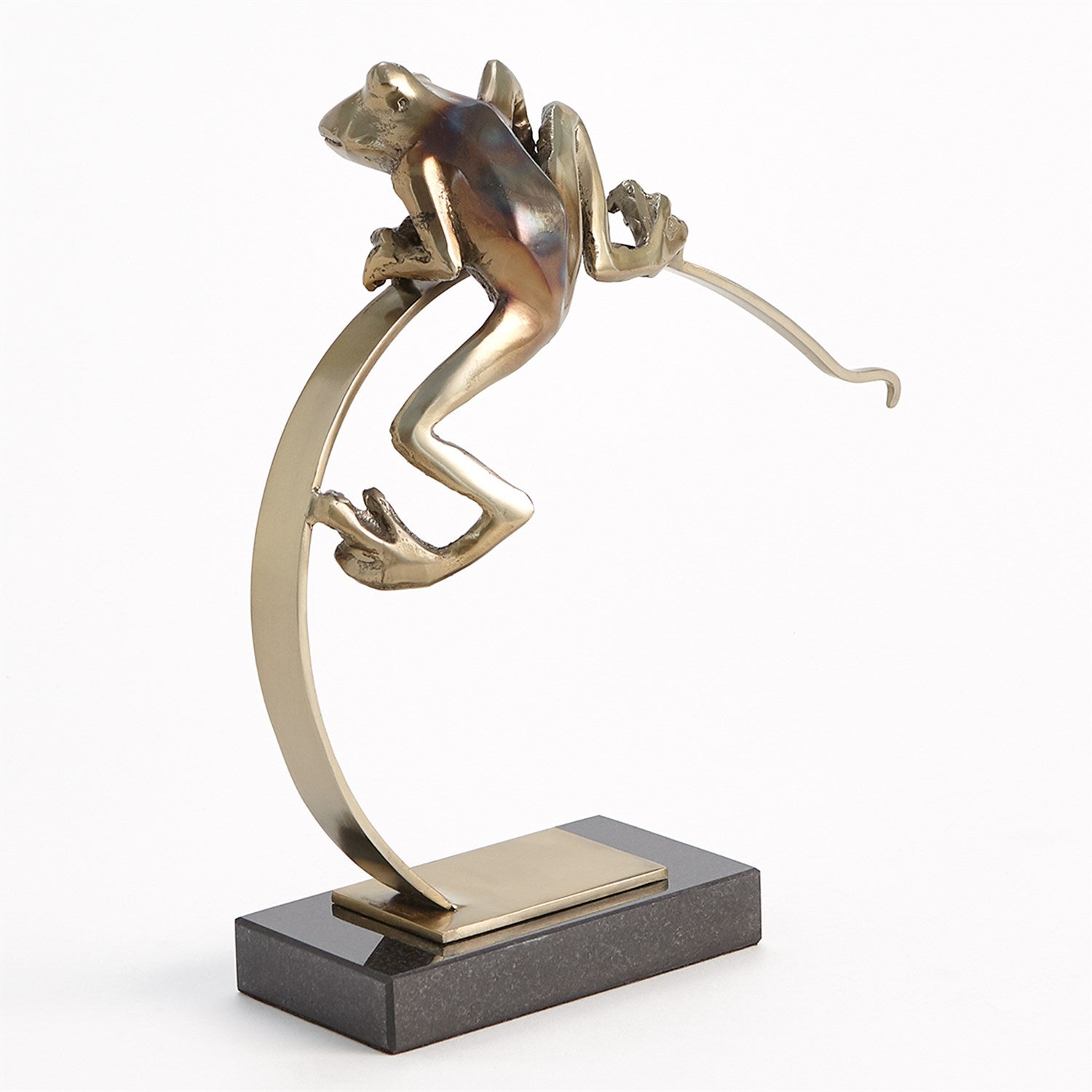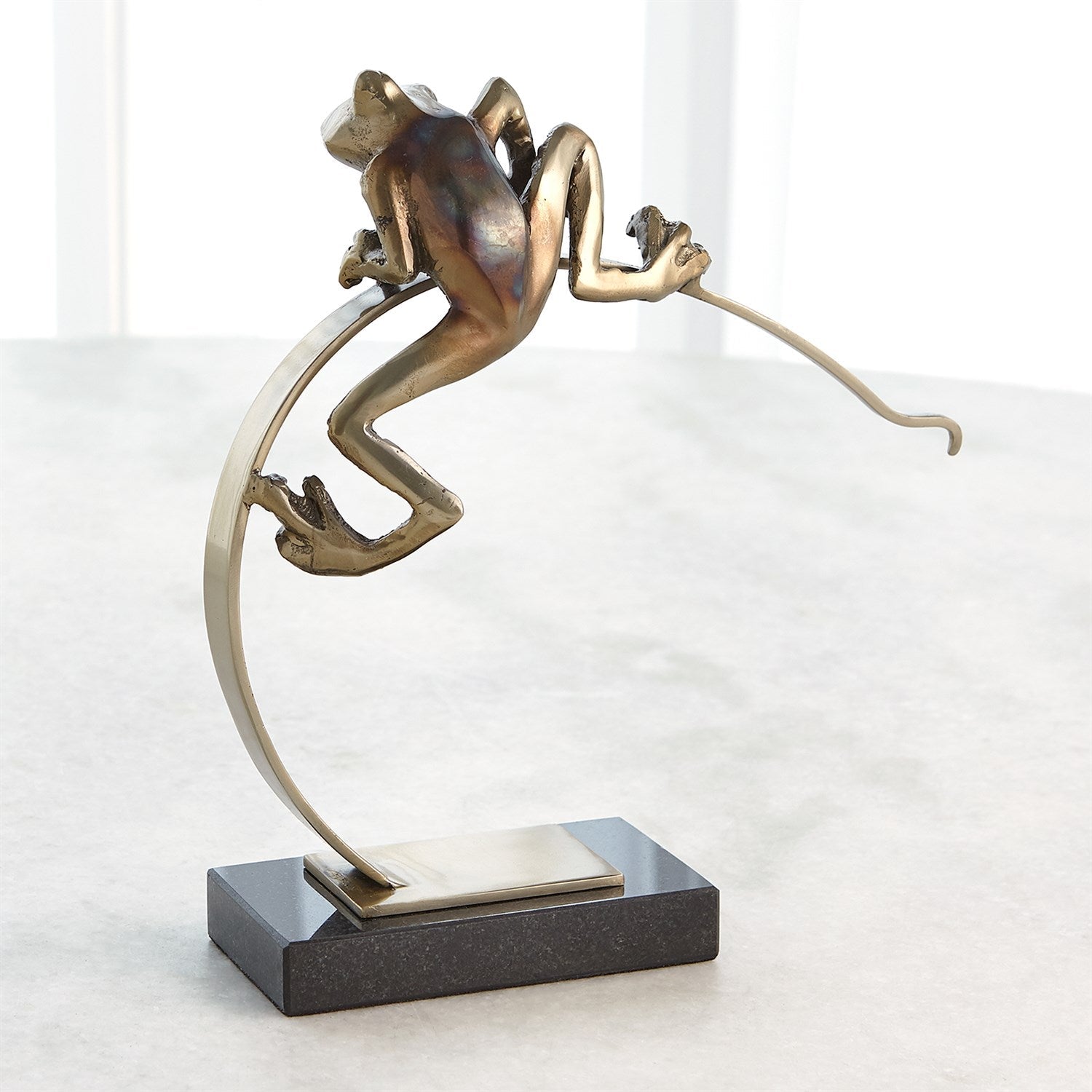 The Frog on Reed Sculpture is made of cast brass with torched details and a black marble base.