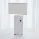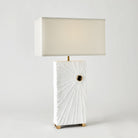 Handcrafted from cast aluminum, the Radiance Lamp boasts a sleek design with a matte white finish and brass accents. It is complemented by a hardback fabric shade for a stylish and sophisticated look.