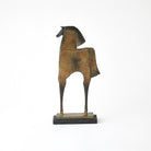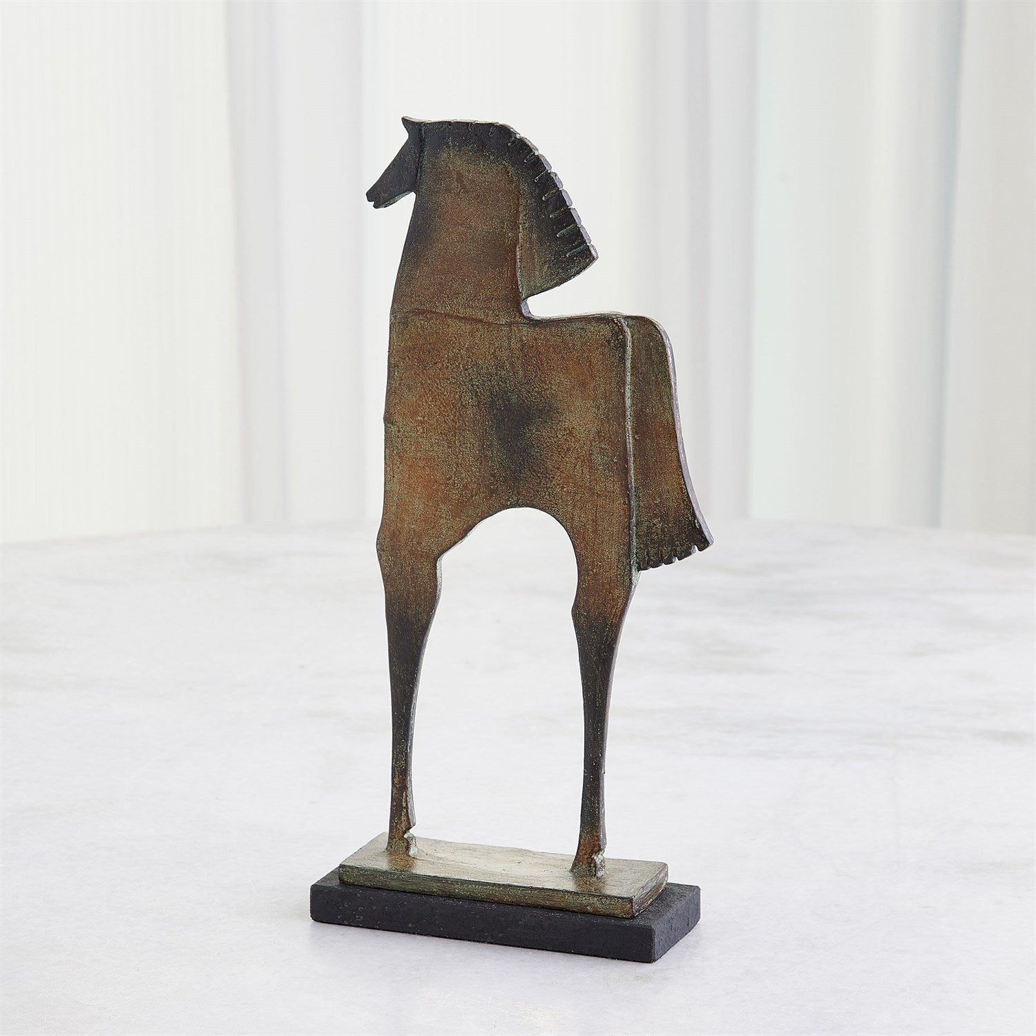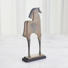 The Trojan Horse Sculpture is handcrafted from cast iron with a brown verdigris finish and sits upon a black granite base.