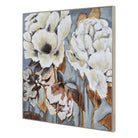 This framed canvas' floral centerpiece brings a romantic flair to clients' classic country or modern rustic homes. Styled among wood-based furnishings, this work of art will integrate effortlessly into its organic-inspired surroundings. The marriage of rich gold tones, gold leaf details and soothing blue give this design great complexity and allows for it to bring both warm and cool energy into the bedroom or living room space.