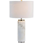 The stately design of this modern table lamp feels statuesque on tabletops throughout the home. A white marble lamp base adds the perfect element of antiquity without feeling old fashioned, thanks to a satin nickel-plated accents and off-white linen drum lampshade. Soft gray veining throughout the base makes this natural stone lamp is a graceful addition to grand interior spaces.