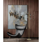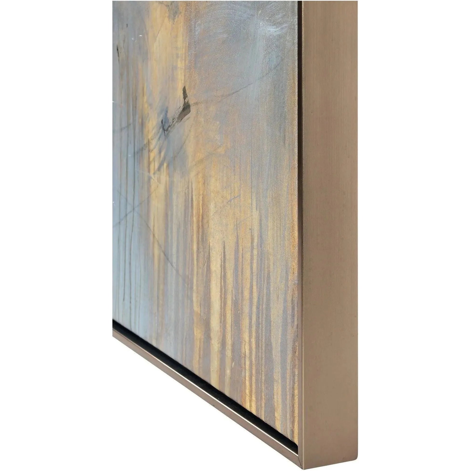 A juxtaposition of organic and glamorous design, this framed oil painting is an idyllic fit for the living room. The textured gold details stand out and sparkle while the soothing tones keep it grounded. At once bold and peaceful, this piece fits seamlessly within a contemporary interior.