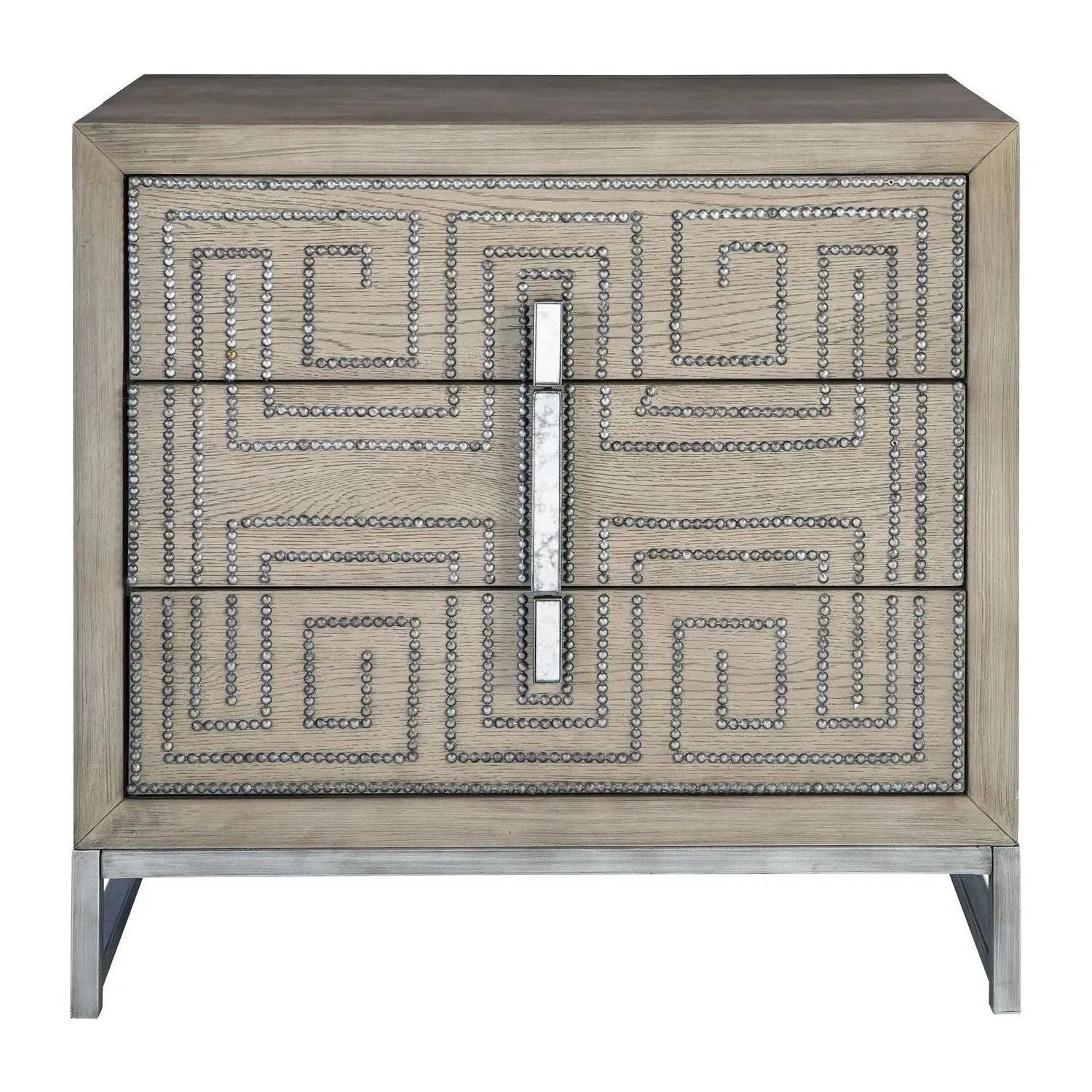 Layered In Oak Veneer In A Soft Mushroom Gray Finish, This Solid Wood Three Drawer Chest Showcases A Geometric Studded Design Finished In Aged Pewter Paired With Mirror Accented Hardware Atop A Coordinating Solid Iron Base.