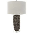 This Ceramic Table Lamp Features A Deep Mushroom Gray Glaze Over Carved Details, Accented With Polished Nickel Plated Details And An Elegant Crystal Foot. The Lamp Is Paired With A Hardback Drum Shade In Light Gray.