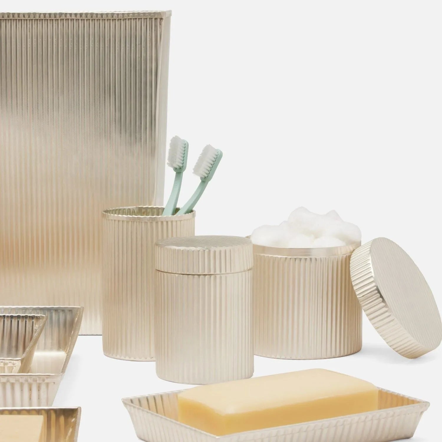 Antique-chic ribbed metal bath collection blending modern industrial with art deco glam.