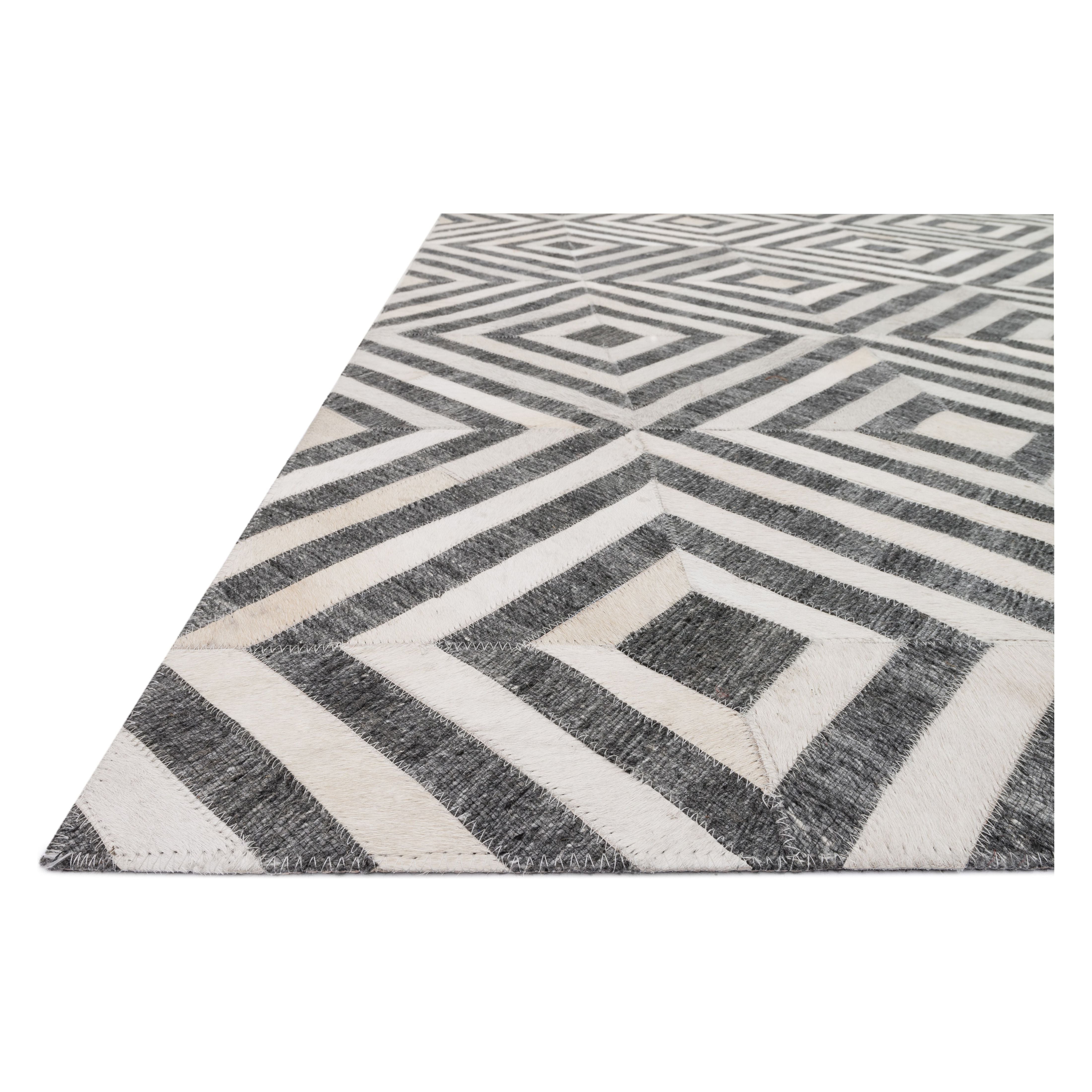 stunning Dorado Db 03 Charcoal Ivory rug from the exquisite Dorado Collection crafted in India. This unique piece combines hand-stitched authentic cowhide with hand-woven viscose to create a striking and distinctive aesthetic. The blend of textures and materials results in a bold yet unexpected design that will elevate any space it graces.