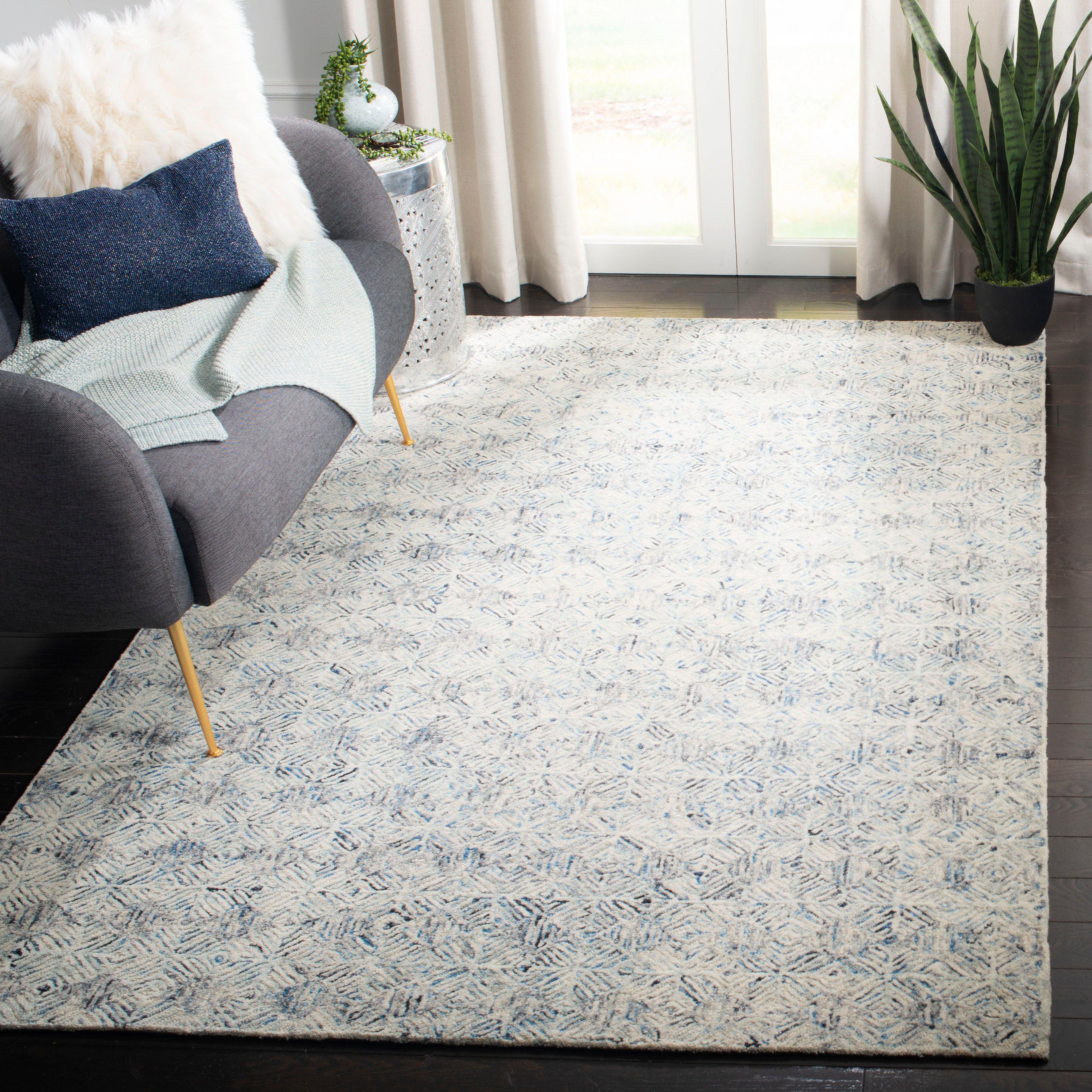 exquisite Renaissance REN629A Blue Ivory rug from Safavieh's renowned collection. Handmade with intricate geometric patterns, this rug showcases superior craftsmanship. The delightful blend of blue, ivory, and grey hues brings a touch of elegance to any room. Crafted from premium wool, these rugs are hand-tufted to ensure impeccable design and vibrant colors. Ideal for the bedroom, living room, home office, or dining room, this rug effortlessly adds a modern twist to your decor.