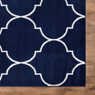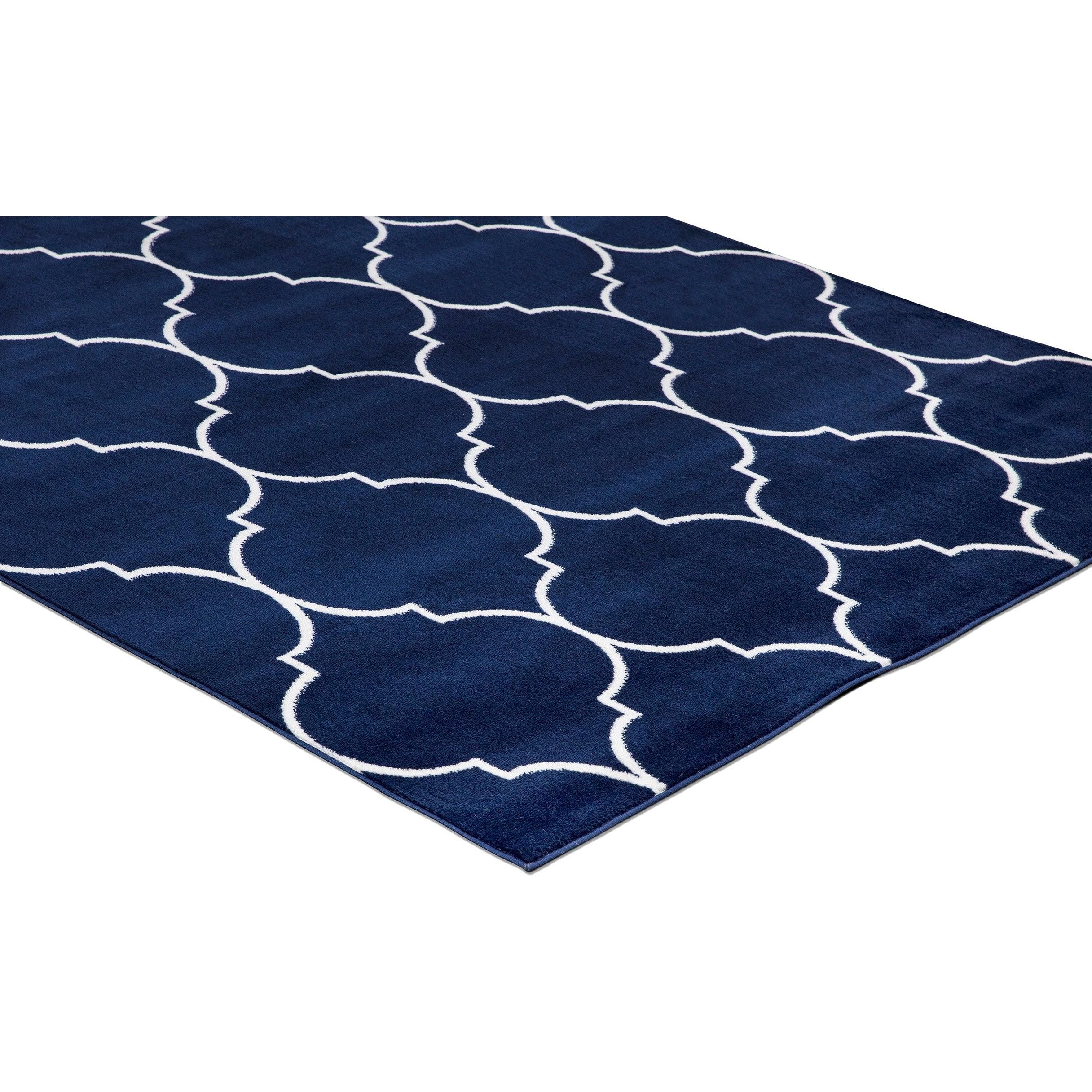 Jefferson Morocco Trellis Navy area rug, a stylish addition to your home decor. This affordable rug is designed to complement your existing style effortlessly. Crafted with stain-resistant fabrics and durable olefin yarn, it's perfect for indoor use, providing long-lasting quality. The minimalist elegance of this design blends seamlessly with modern fashion trends, enhancing the ambiance of any room.