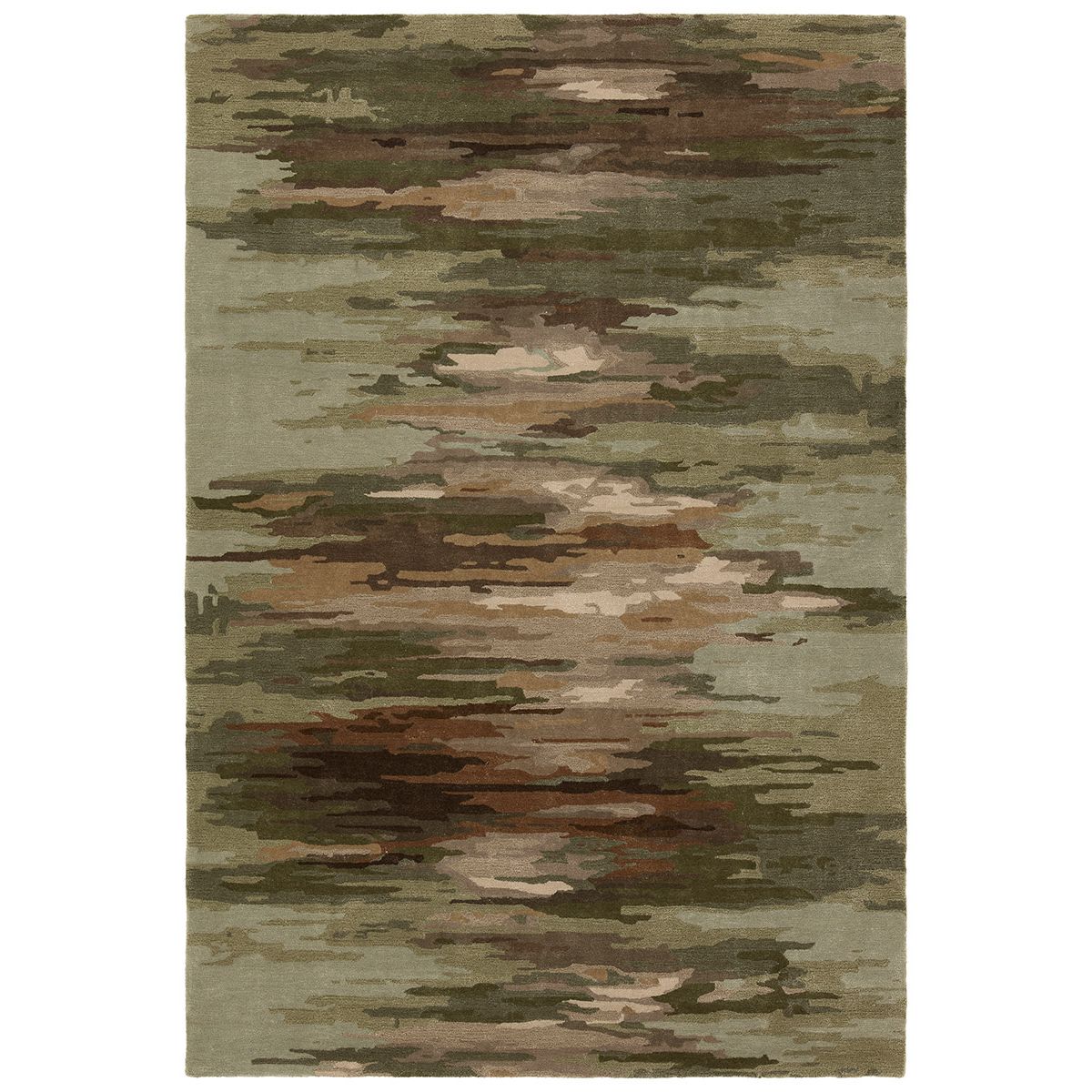 Infused with a whimsical spirit and sophisticated flair, the Genesis collection brings an artistic edge to any contemporary home. The Ryenn design features an abstract, grounding green and brown pattern, enhanced with a lustrous sheen reminiscent of shimmering water reflections.