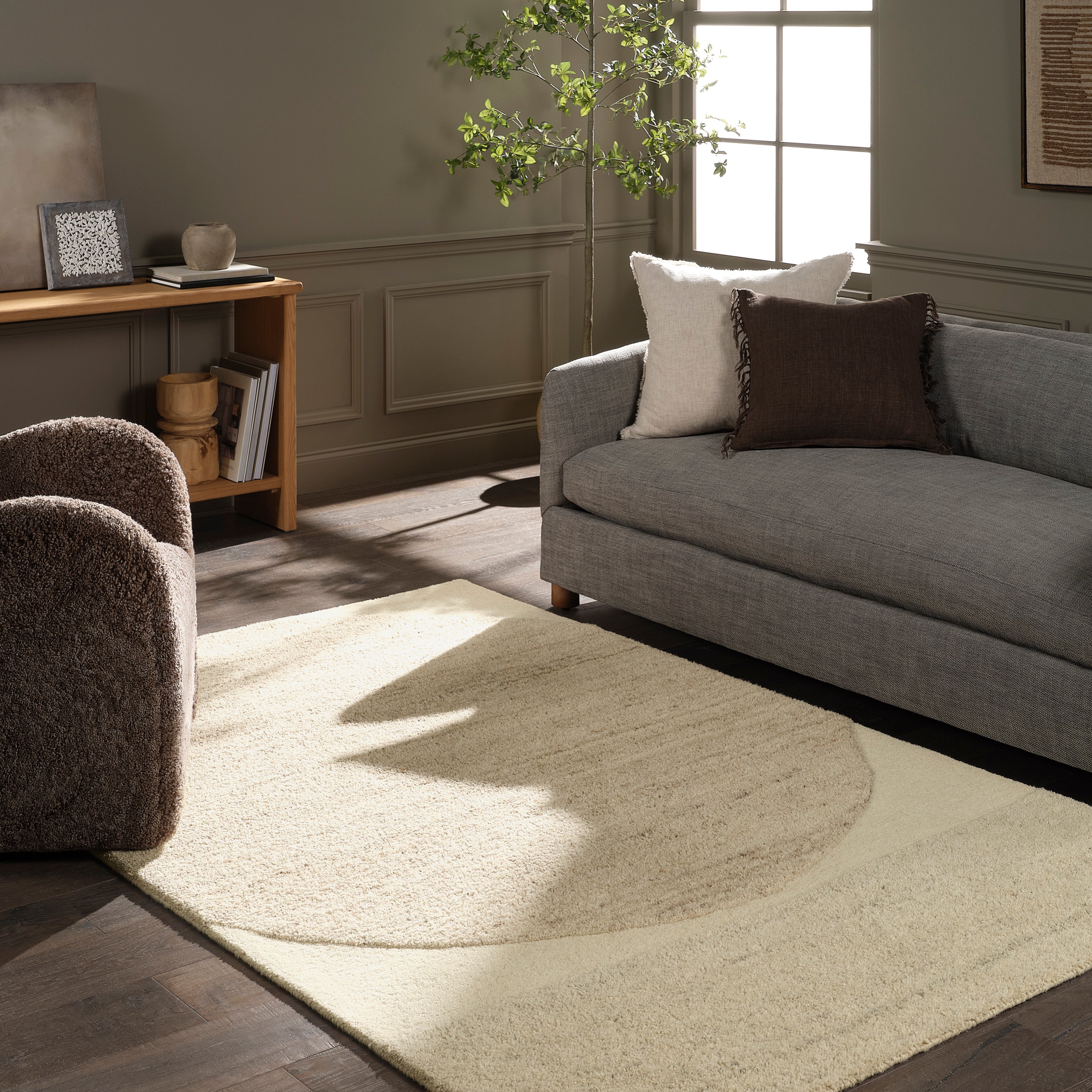 Add a contemporary flair to floors with the Reyner collection. Hand-tufted from 100% handspun, undyed wool, the plush rug features a high-low pile that accentuates its mid-century, Brutalist-inspired geometric pattern. Easy-to-match shades of tan and taupe to add warmth and depth to any interior.