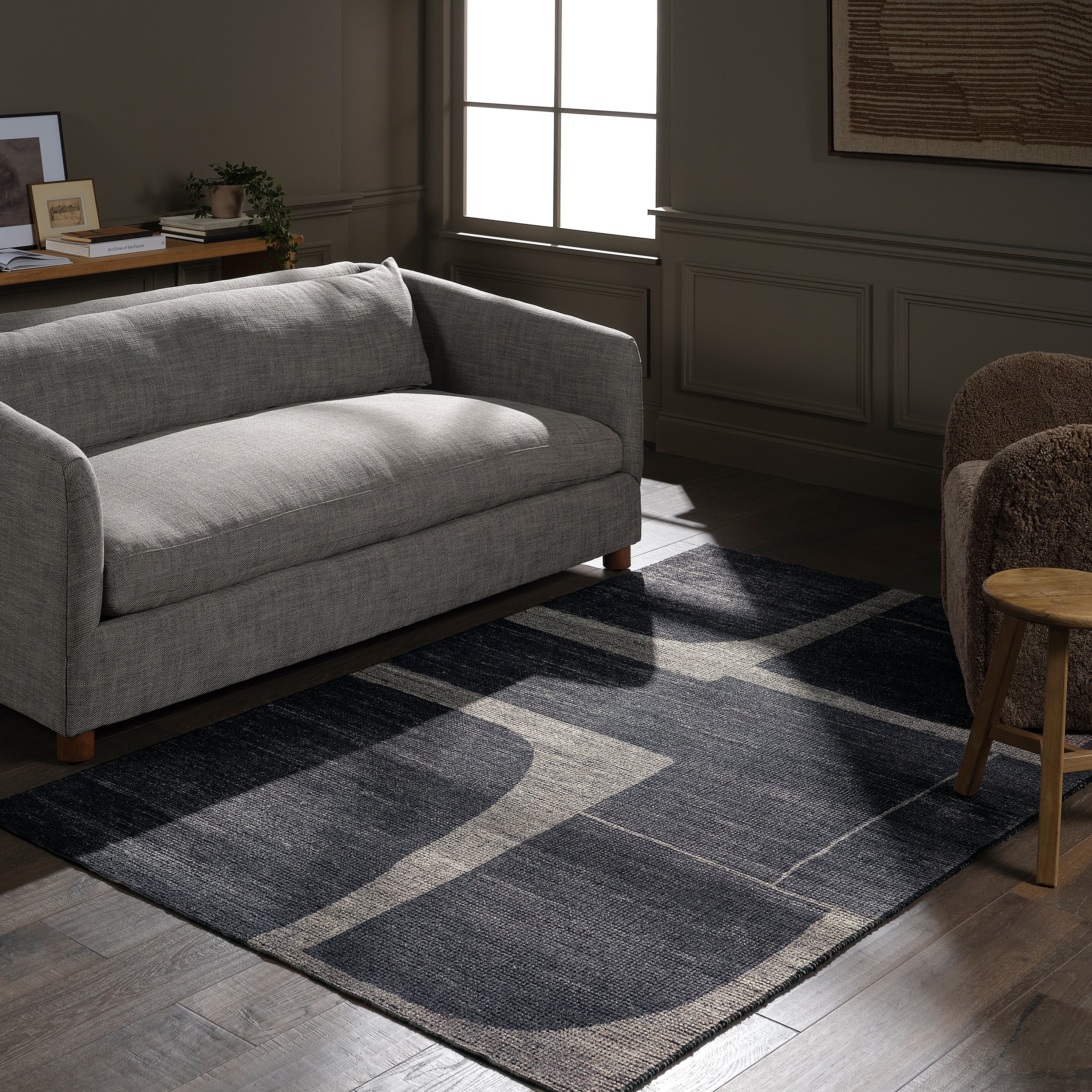 The Braith design features a Brutalist-inspired modern geometric look that’s sure to make a statement. A digital print is layered on a handwoven base, offering durability and easy care—with a sophisticated, high-end look.