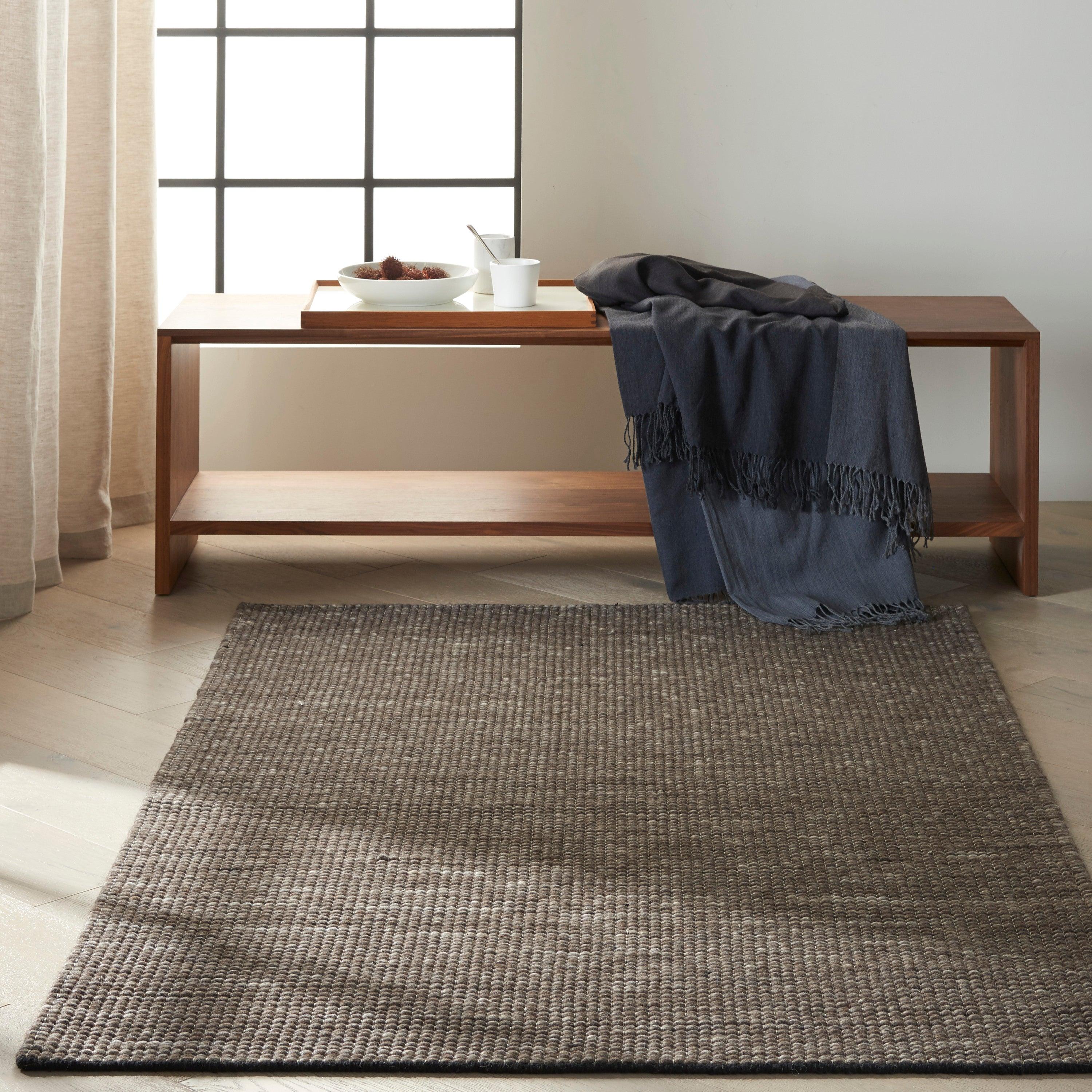 CK218 Lowland LOW01 Flint area rug, a stunning addition to any home decor. Crafted from ultra-soft, all natural wool in beautiful neutral tones, this hand-woven rug offers a tactile textural appeal with its nubby wool loop design. The clean and contemporary aesthetic of the Lowland collection is truly timeless, making it a versatile choice for various interior styles. Each rug features natural hues and highlights that add dimension and movement, reflecting the sophisticated design synonymous with Calvin Klein.