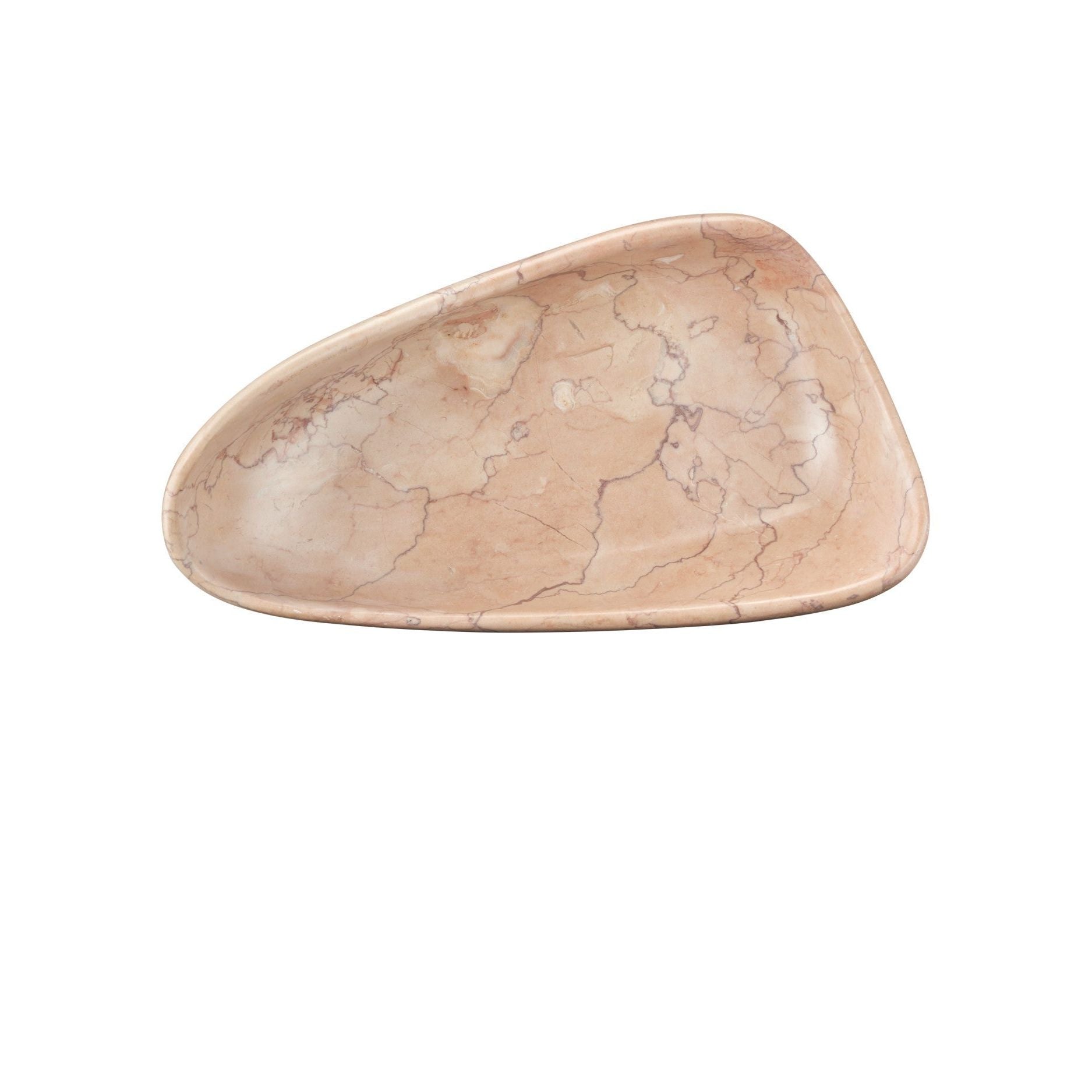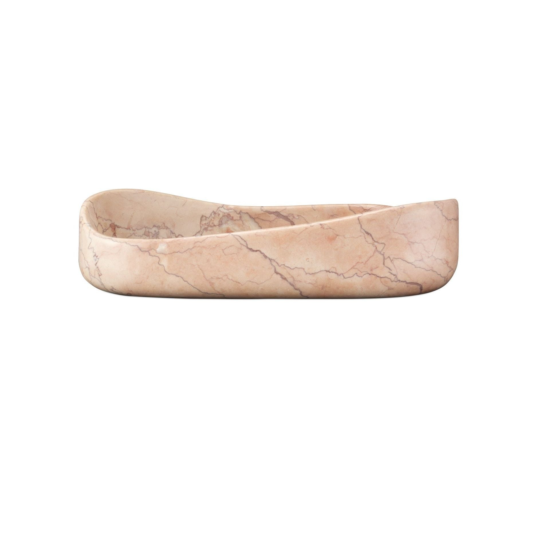 The Deaton Rosa Marble Bowl is an elegantly organic decorative piece with a gently undulating shape. Crafted from Rosa Cappuccino marble, its soft pink surfaces are enhanced by darker veining that creates a personable pattern. Empty, it is a statement accent that can also be perfect or for showcasing cherished items. This is a generously sized decorative bowl at fourteen-and-a-half inches long by eight-and-a-half inches wide.