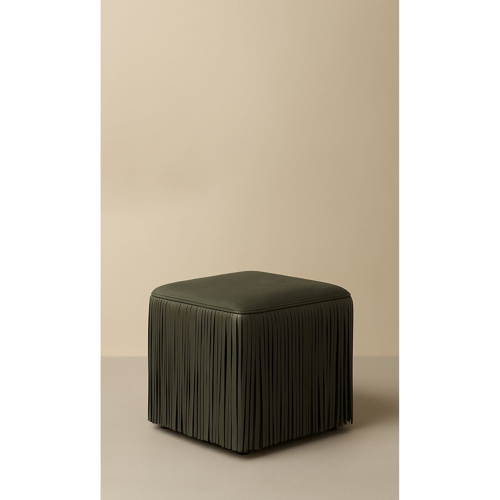 Ina Fringe Leather Ottoman - Olive Green
