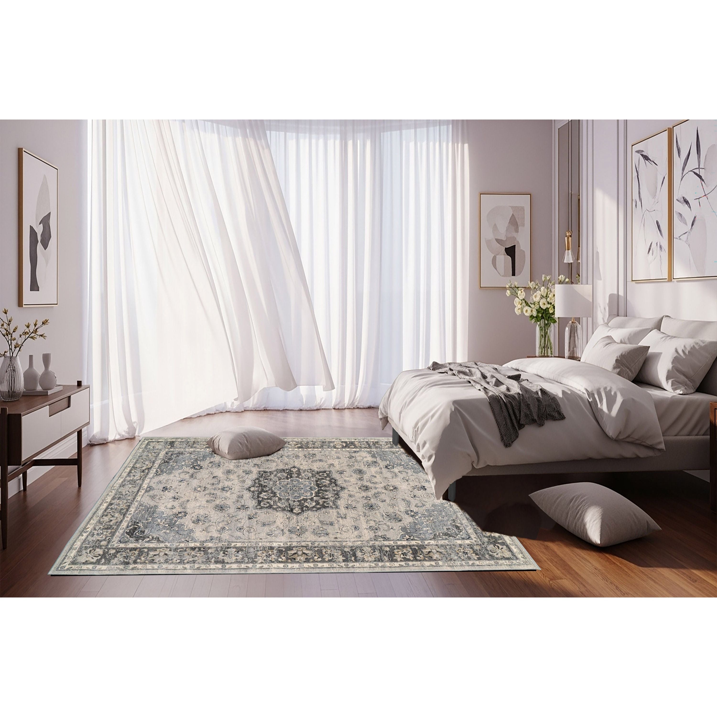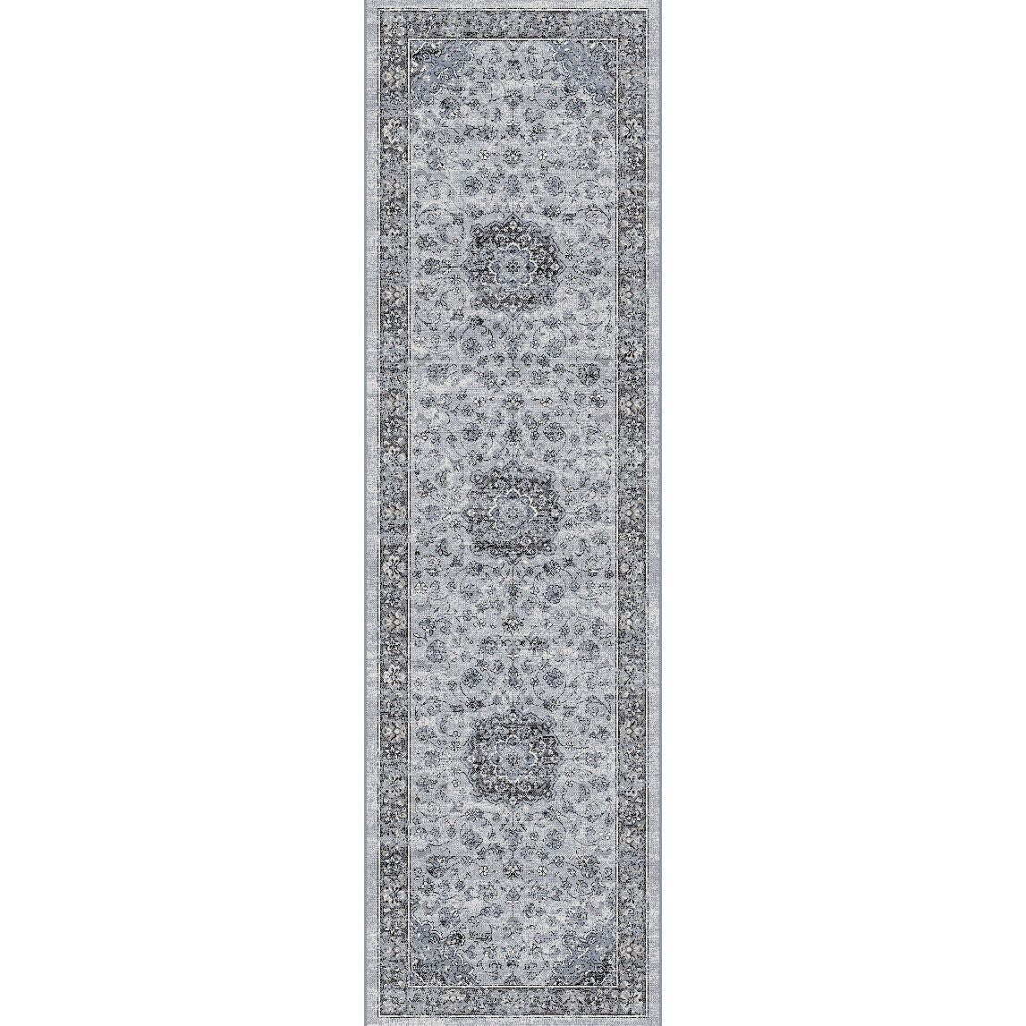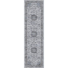 Ancient Garden 57559 Silver Grey rug, a fusion of classic Persian motifs with a contemporary twist. This rug effortlessly blends traditional elegance with a modern aesthetic. The color palette is meticulously curated, featuring antique hues that accentuate the intricate design elements. Crafted with Decolan, a luxurious wool-like heat set polypropylene material, Ancient Garden exudes the charm of hand-knotted rugs while being machine-made for durability.