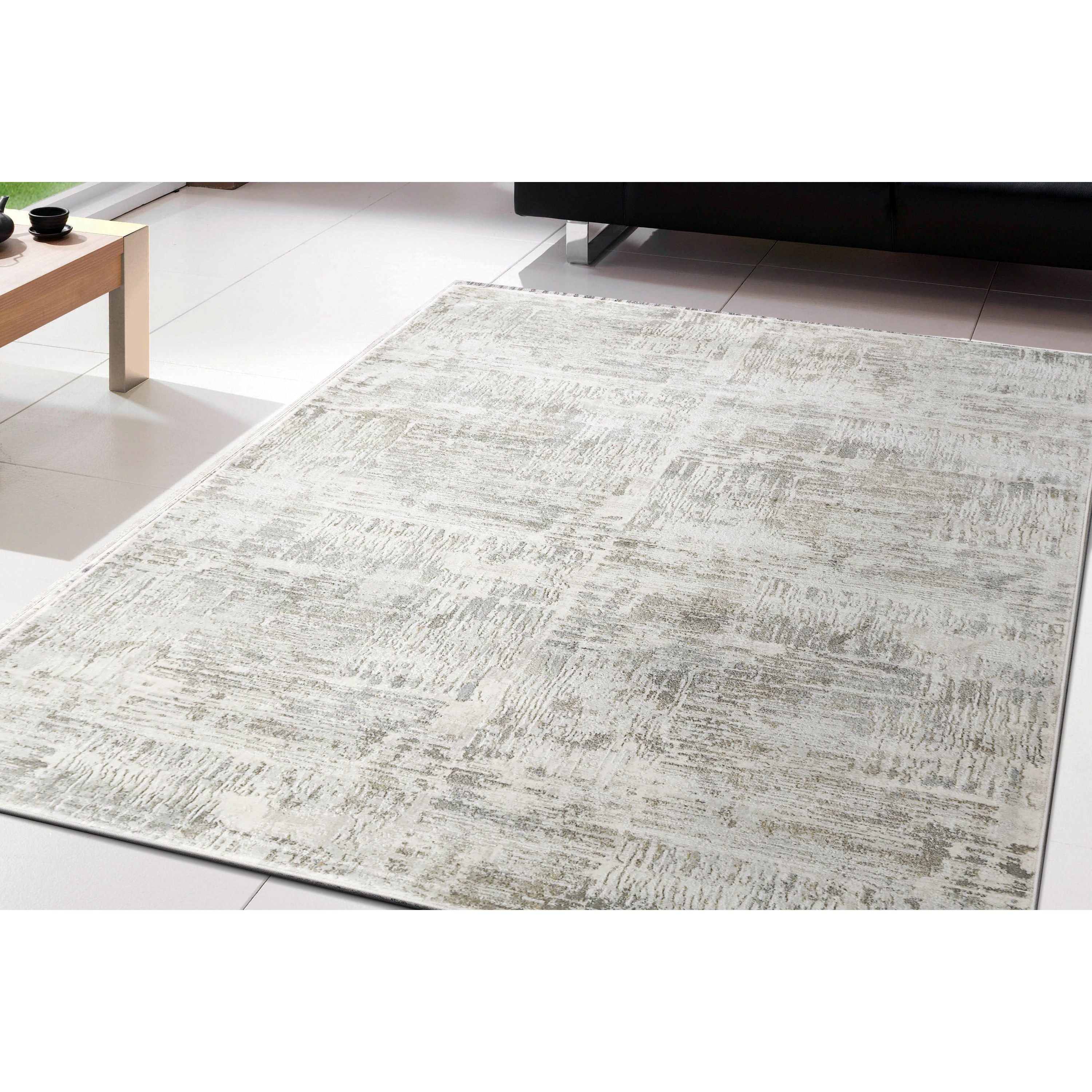 exquisite Castilla 3555 Ivory Grey rug, a stunning blend of shrink polyester and polypropylene crafted with precision in Turkey. This machine-made masterpiece boasts tightly packed fibers that offer a luxurious density to the touch and a mesmerizing shimmering sheen to the eye.