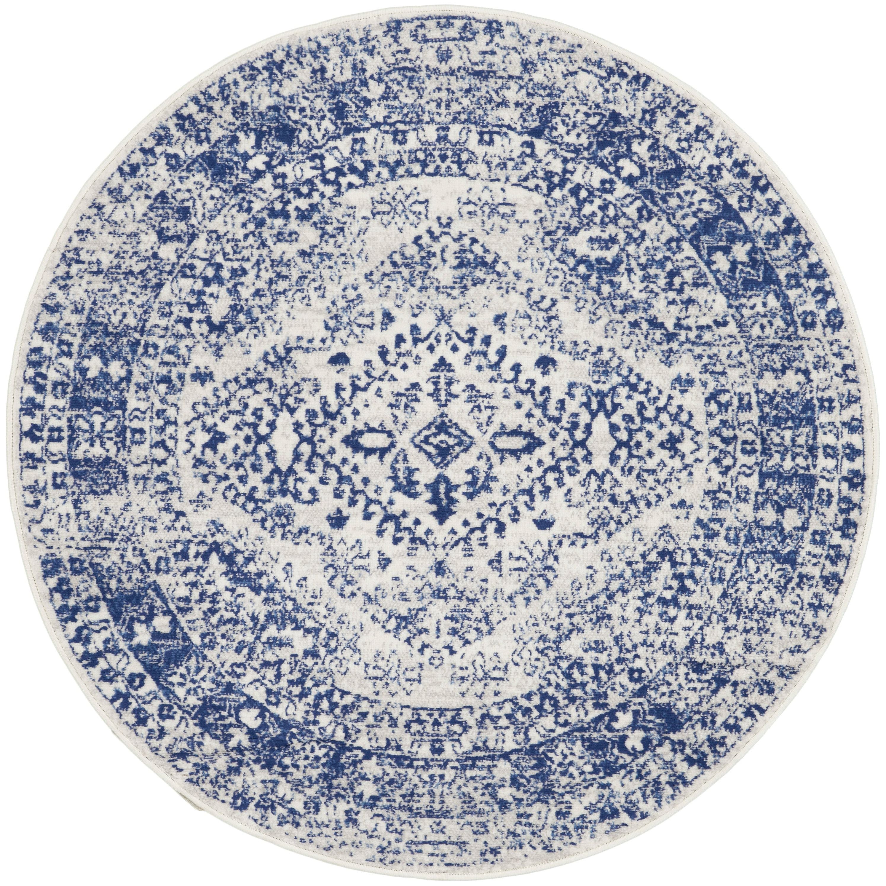 charming Whimsicle WHS15 Ivory Navy rug from our eclectic collection. Embrace true bohemian flair with a mix of tribal, geometric, and classic floral designs. The vintage patinas in neutral shades give a stylish touch to any decor theme. Crafted expertly with soft polyester, these low-profile rugs are perfect for your living room, bedroom, dining area, or home office.