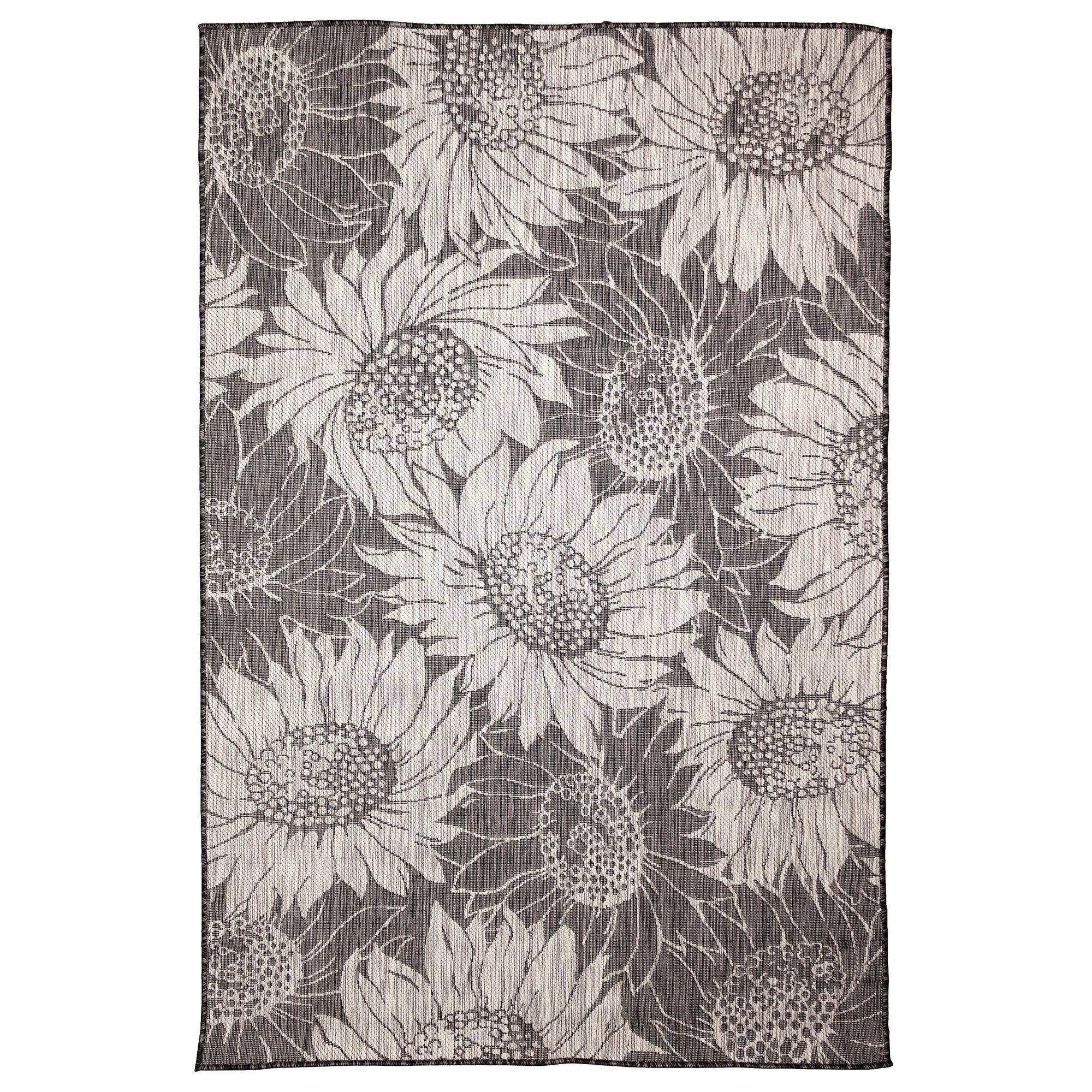 Carmel Sunflower Field Black area rug, a stunning addition to any space. This machine-made rug showcases an oversized sunflower design in elegant grey and black tones. Crafted in Turkey from 100% polypropylene, the Carmel Collection is Power Loomed to achieve intricate multi-toned designs with a premium finish.