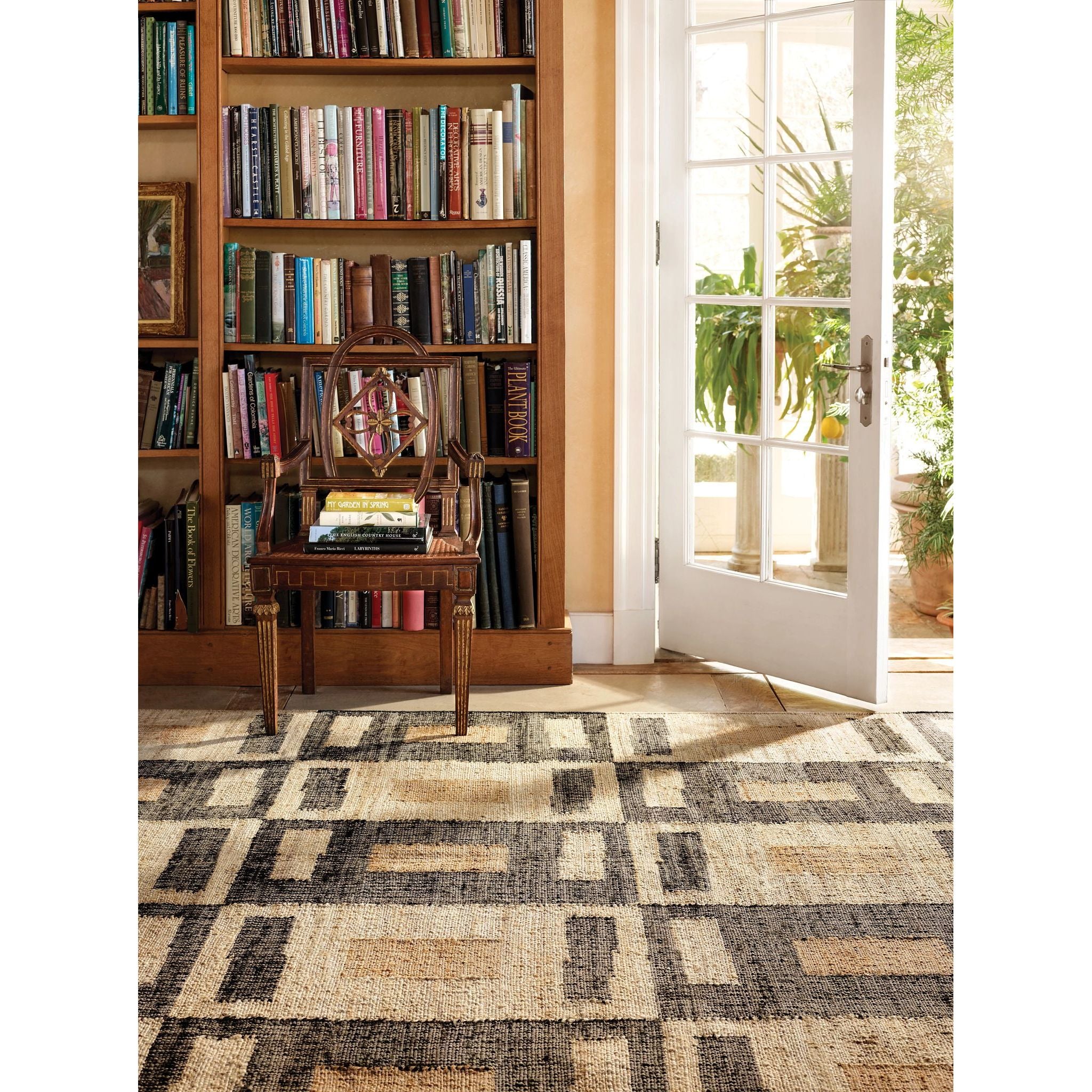 In her latest capsule collection, Annie's friend and collaborator Bunny Williams was inspired by the unique geometric Kuba weaving of central Africa. The sacred Kuba designs are mathematical and rhythmic in vegetable-dyed earth tones and evolved from a number of techniques featuring flat weaving and cut pile, with patchwork, embroidery, and appliqué. The Cassia dhurrie weave rug has a balanced block motif woven onto alternating rectangles of natural, black and bleached oak. Hard working jute fiber is sophisticated and practical, especially for high traffic areas.