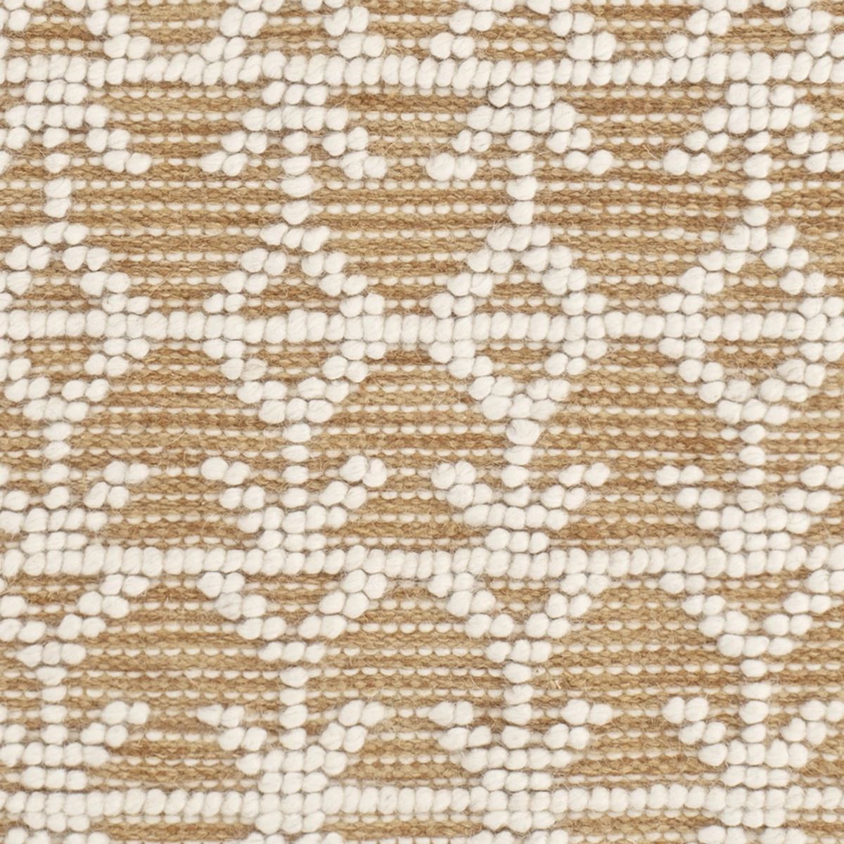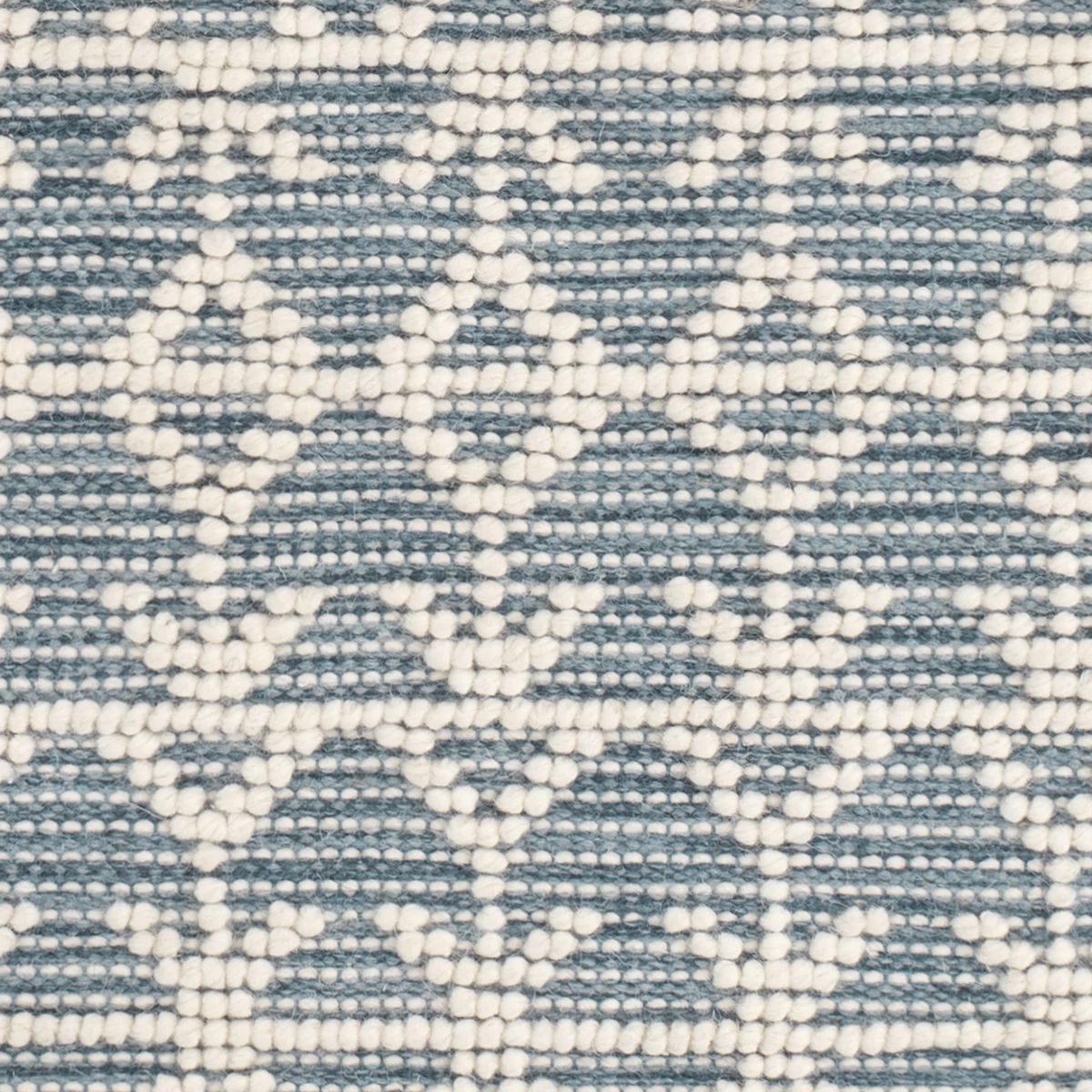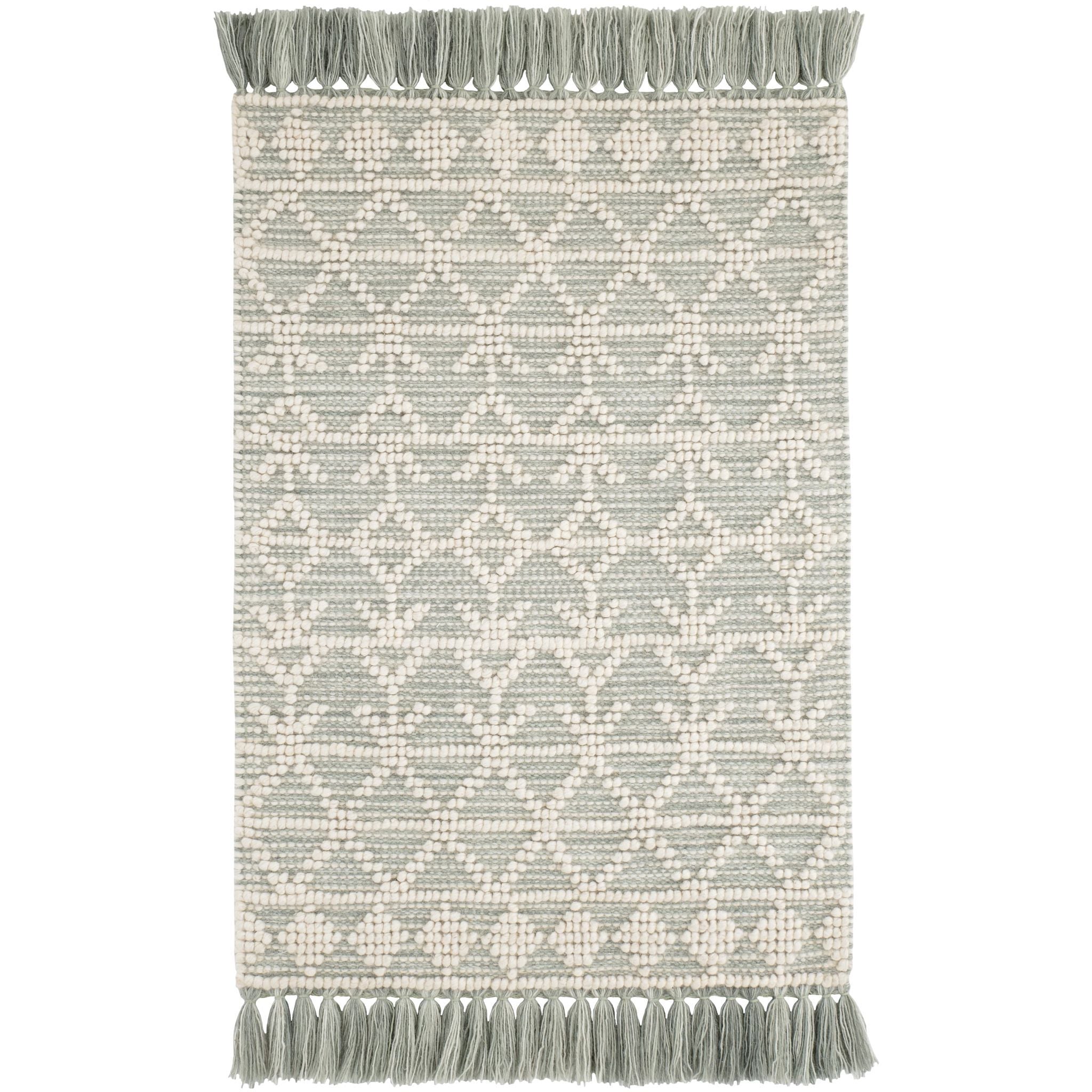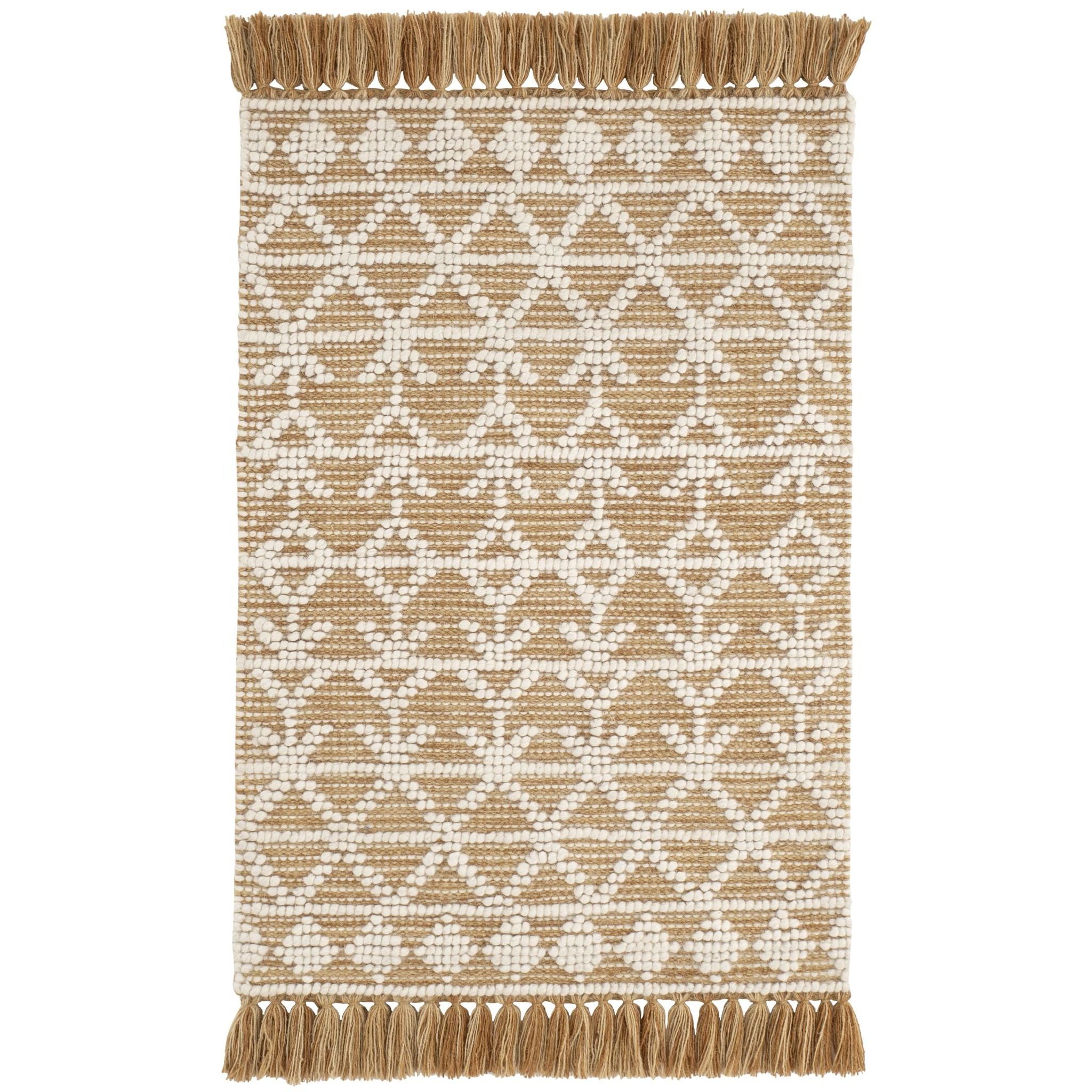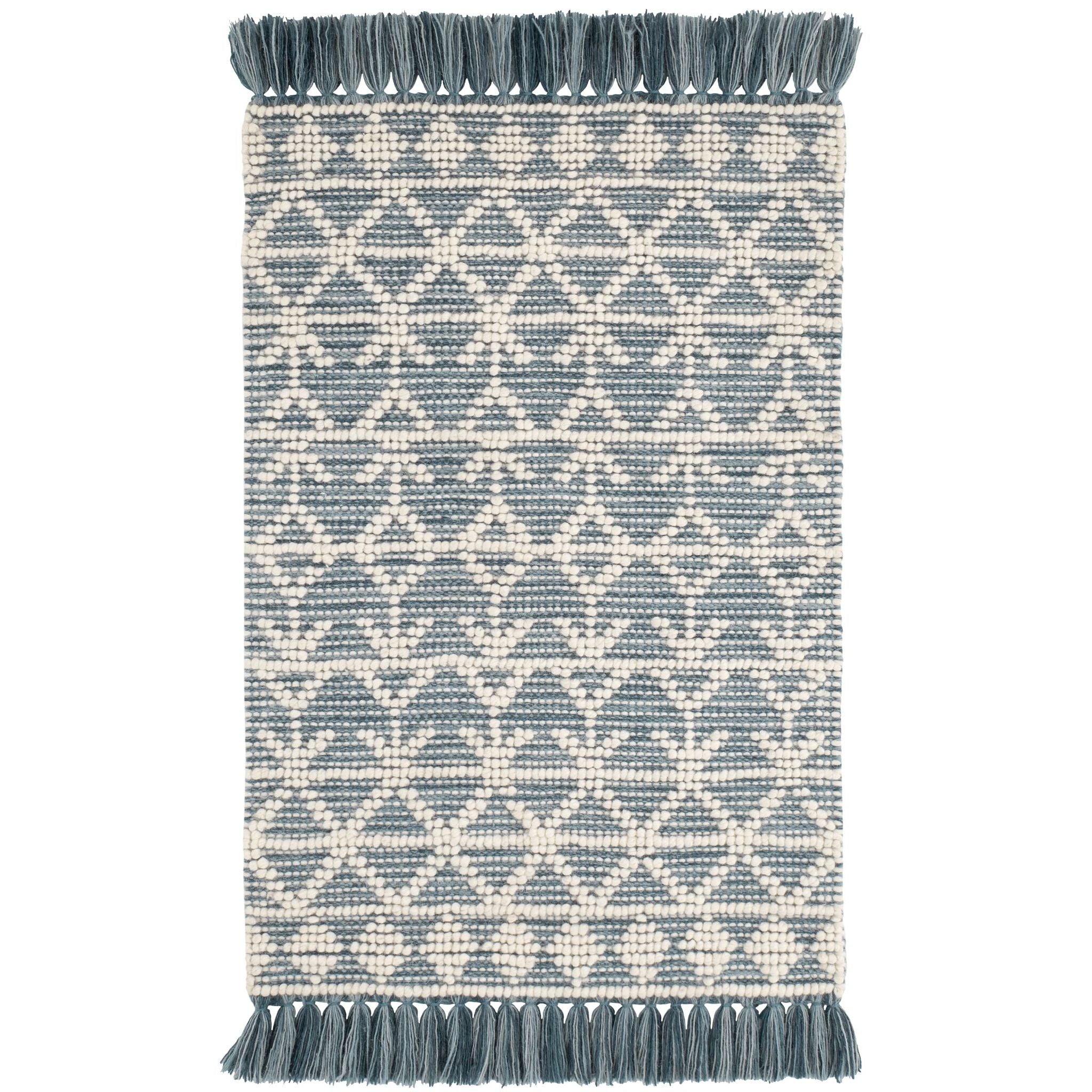 The Pembrook Handwoven Wool Rug has an intricate, Fair Isle-inspired pattern made from raised ivory loops on a flatwoven background. Durable and soft, with a classic knotted fringe to complete the look.