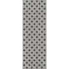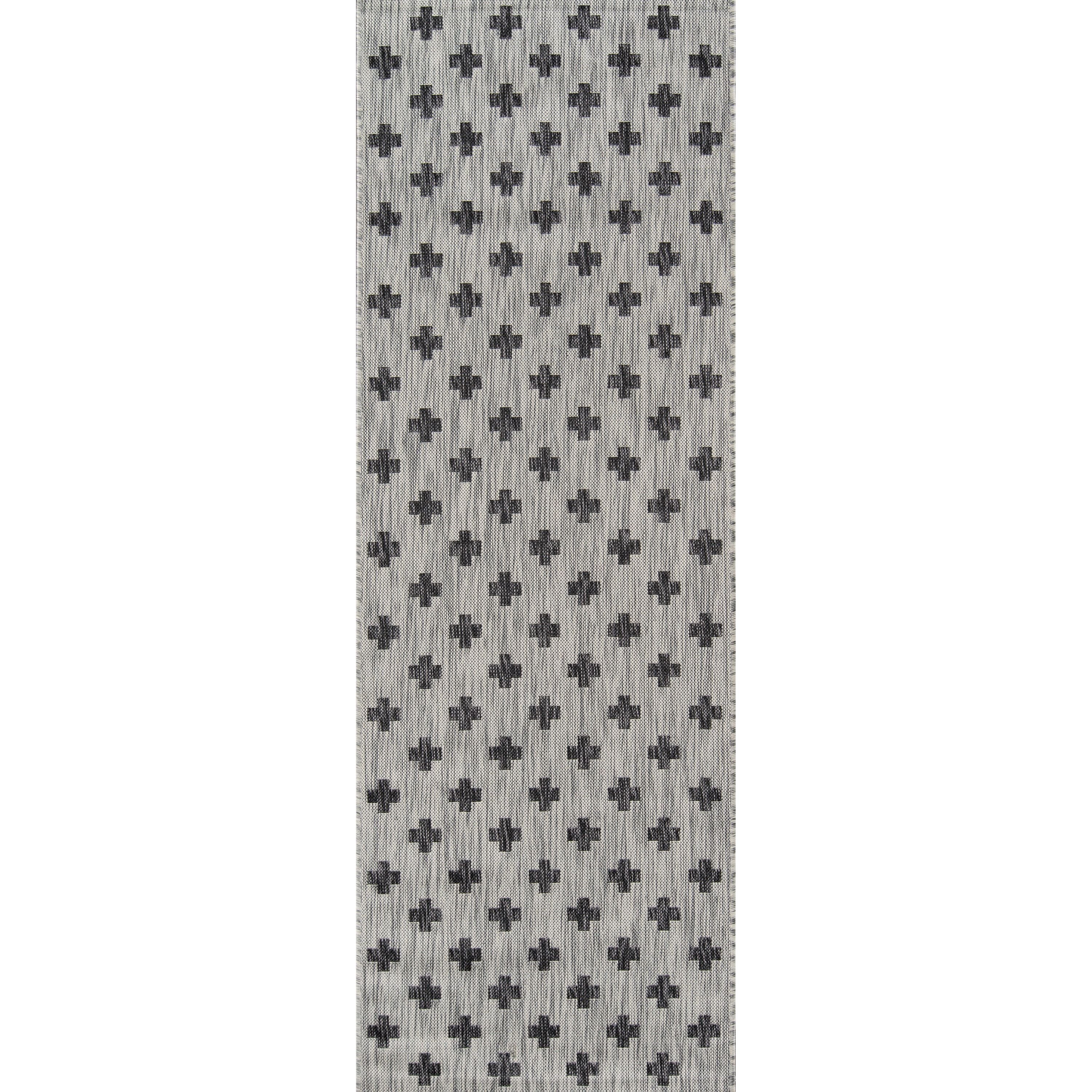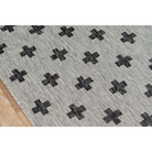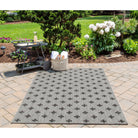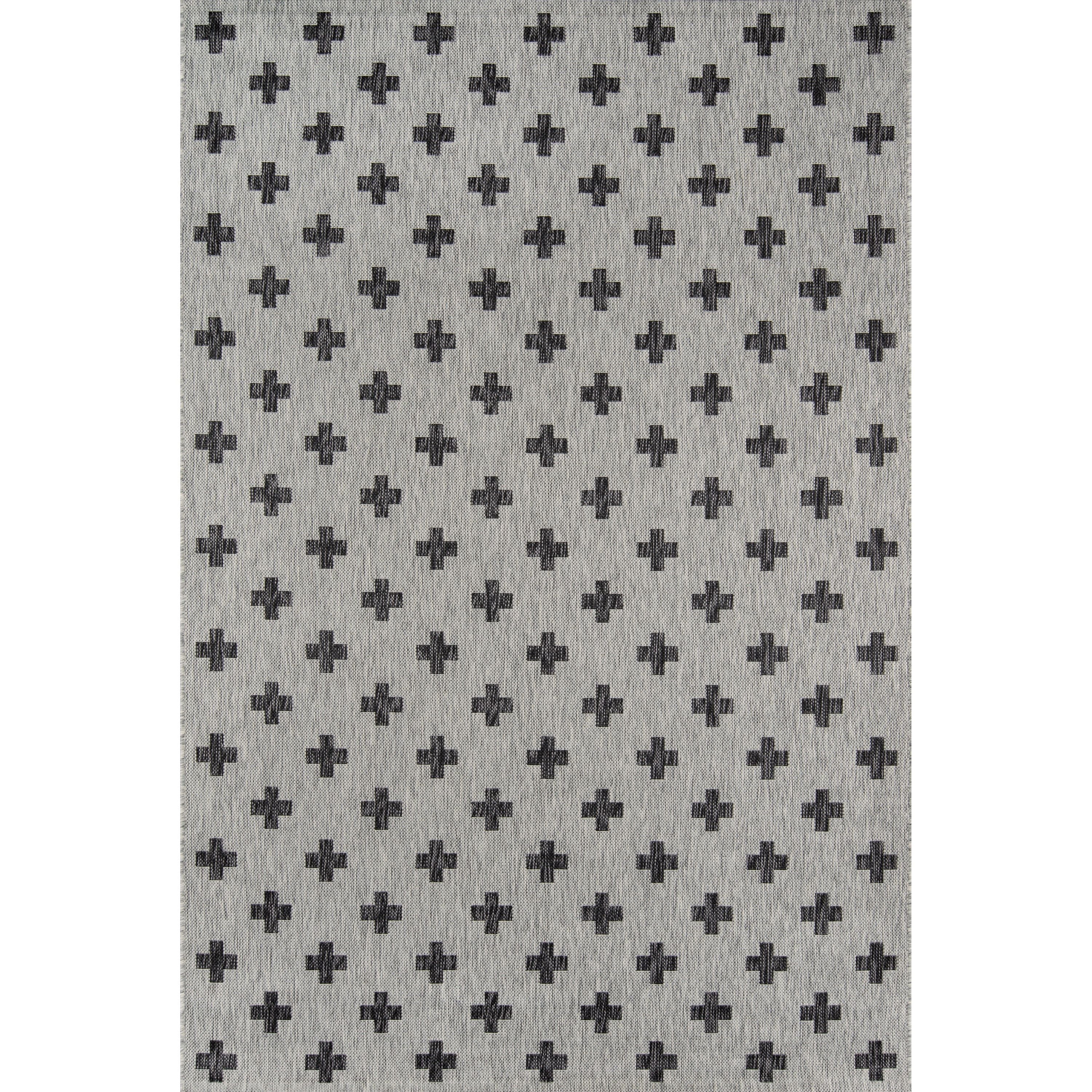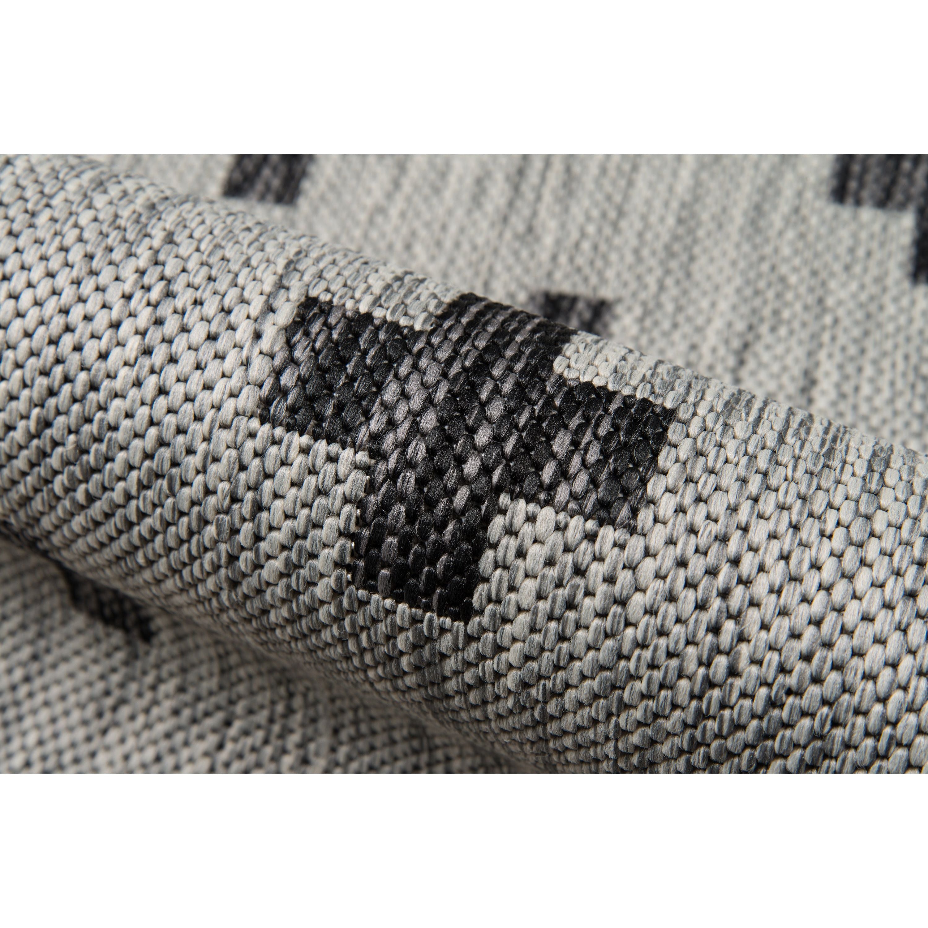 Villa Vi 01 Grey, a versatile indoor/outdoor rug collection that adds a touch of contemporary style to any space. Inspired by global architectural designs, these modern rugs feature bold patterns that make a statement in your home or outdoor area. The color palette includes striking shades of charcoal grey, chambray blue, fuchsia pink, and russet red, creating a visually appealing look.