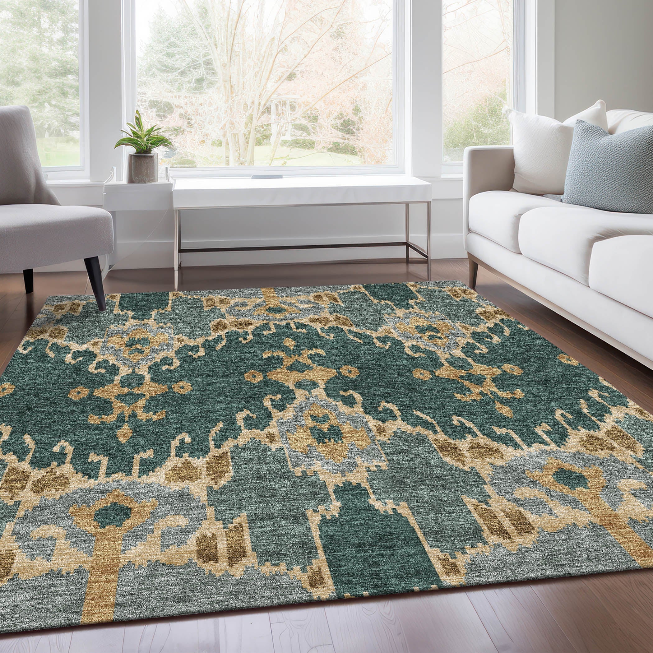 Chantille ACN748 Cactus rug, a refreshing interpretation of the timeless Ikat pattern with a modern touch. This versatile rug effortlessly blends traditional elements with contemporary style, making it a striking addition to any living space.