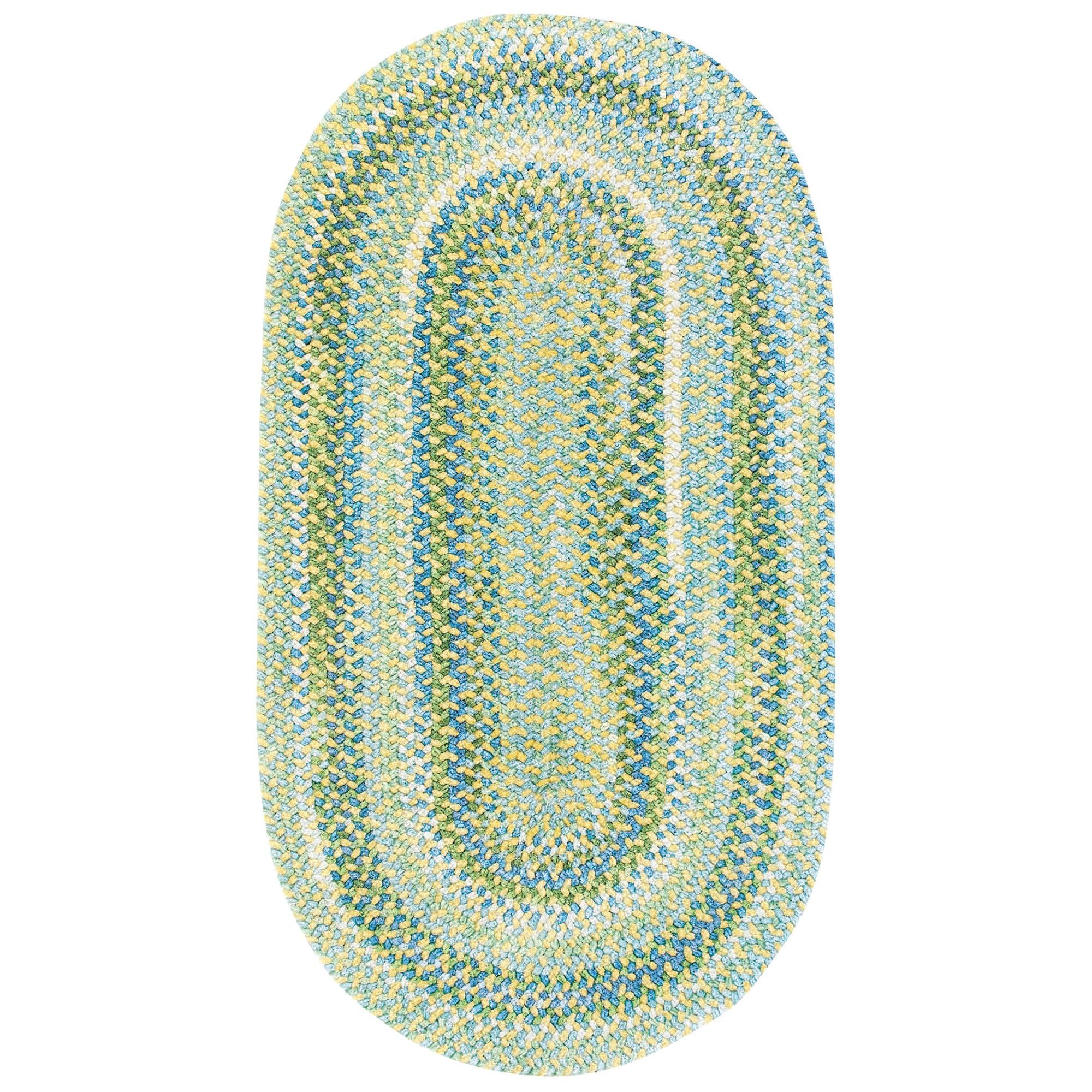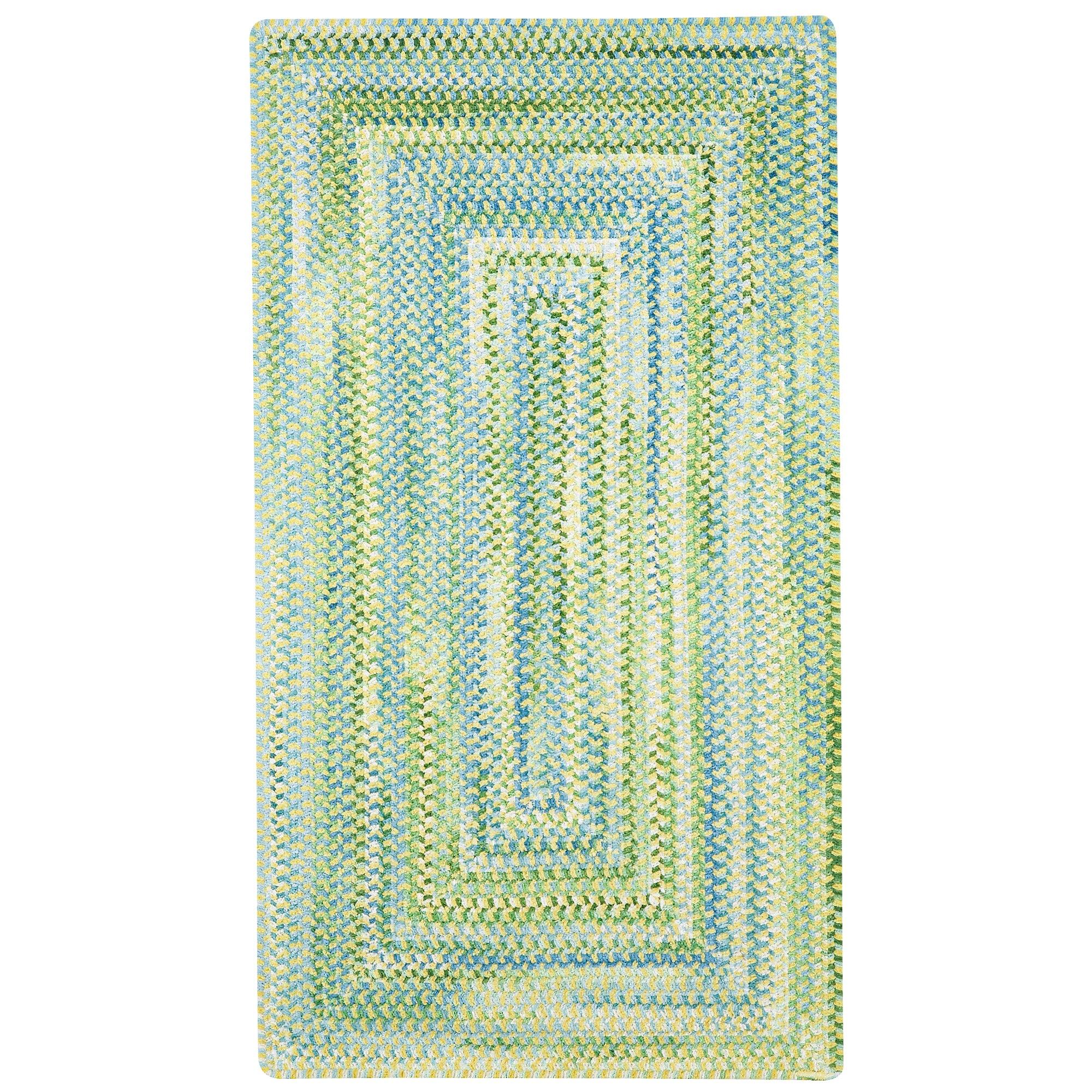 Waterway Yellow rug, a delightful addition to your home decor. Crafted from soft cotton chenille, this rug provides a plush and comfortable feel underfoot. The tranquil blues and greens of the design evoke images of water and sky, bringing a sense of calm to any space.