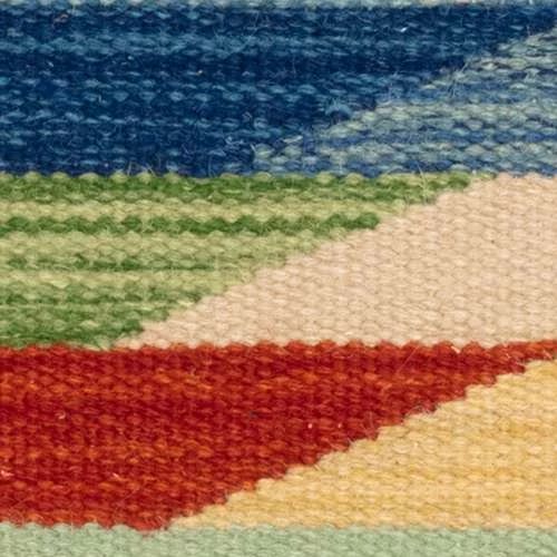 One of the timeless creations from the design collaboration between Annie and Kit Kemp, co-owner and Creative Director for Firmdale Hotels. Drawing inspiration from a one of a kind antique weaving, this incredible flatwoven wool rug contains over twenty colors, kilim woven together as geometric diagonally interlocking stripes. A myriad of marled shades from Soft Blue through Aqua to Sprout and Leaf create a harmonious composition with notes of Spice, Russet, Lavender, Coral and Gold. Annie and Kit are united by their passion for colorful and carefree design, redefining contemporary Arts and Crafts for everyday life.
