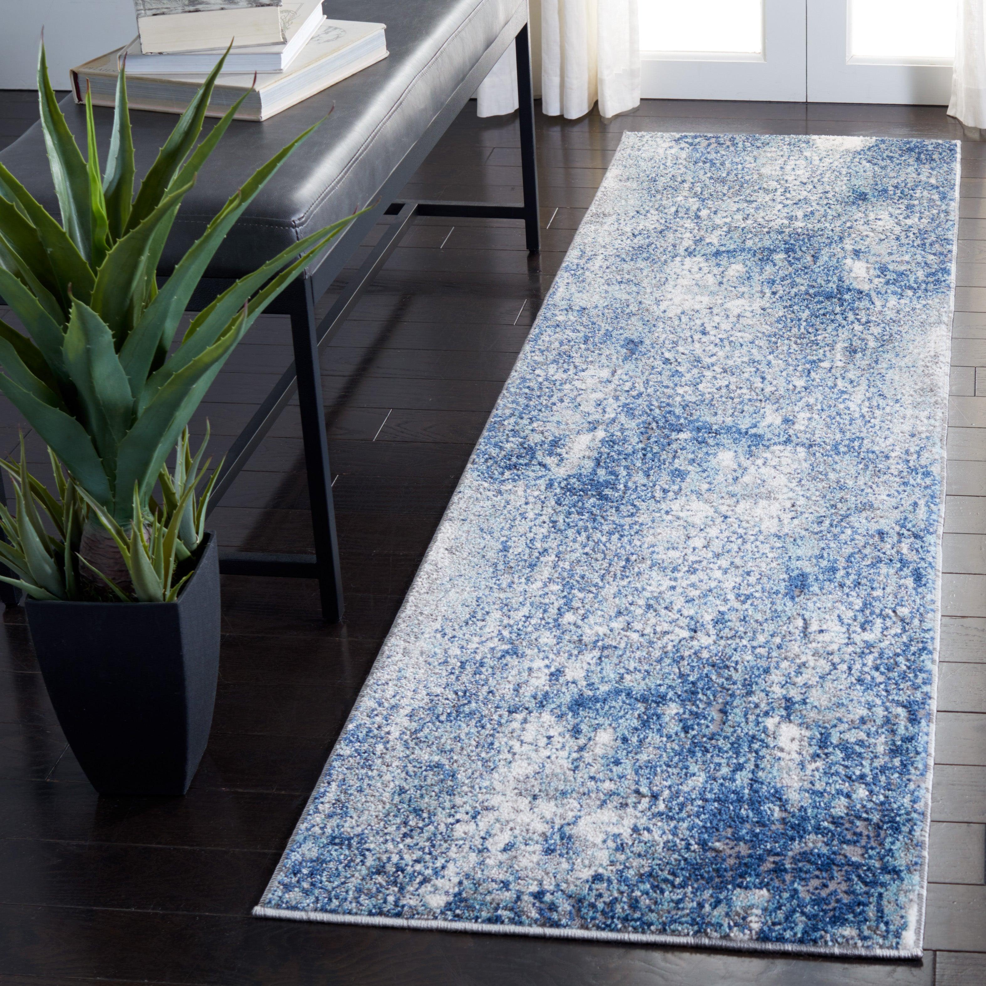 Elevate your living space with the Aston ASN706N area rug from the SAFAVIEH Aston Collection. Featuring captivating abstract patterns and cool tones, these modern rugs add a touch of contemporary chic to any room. Crafted with a textured cut pile and soft synthetic yarns, these machine-woven rugs offer both lasting beauty and comfort, with an approximate thickness of 0.43 inches.