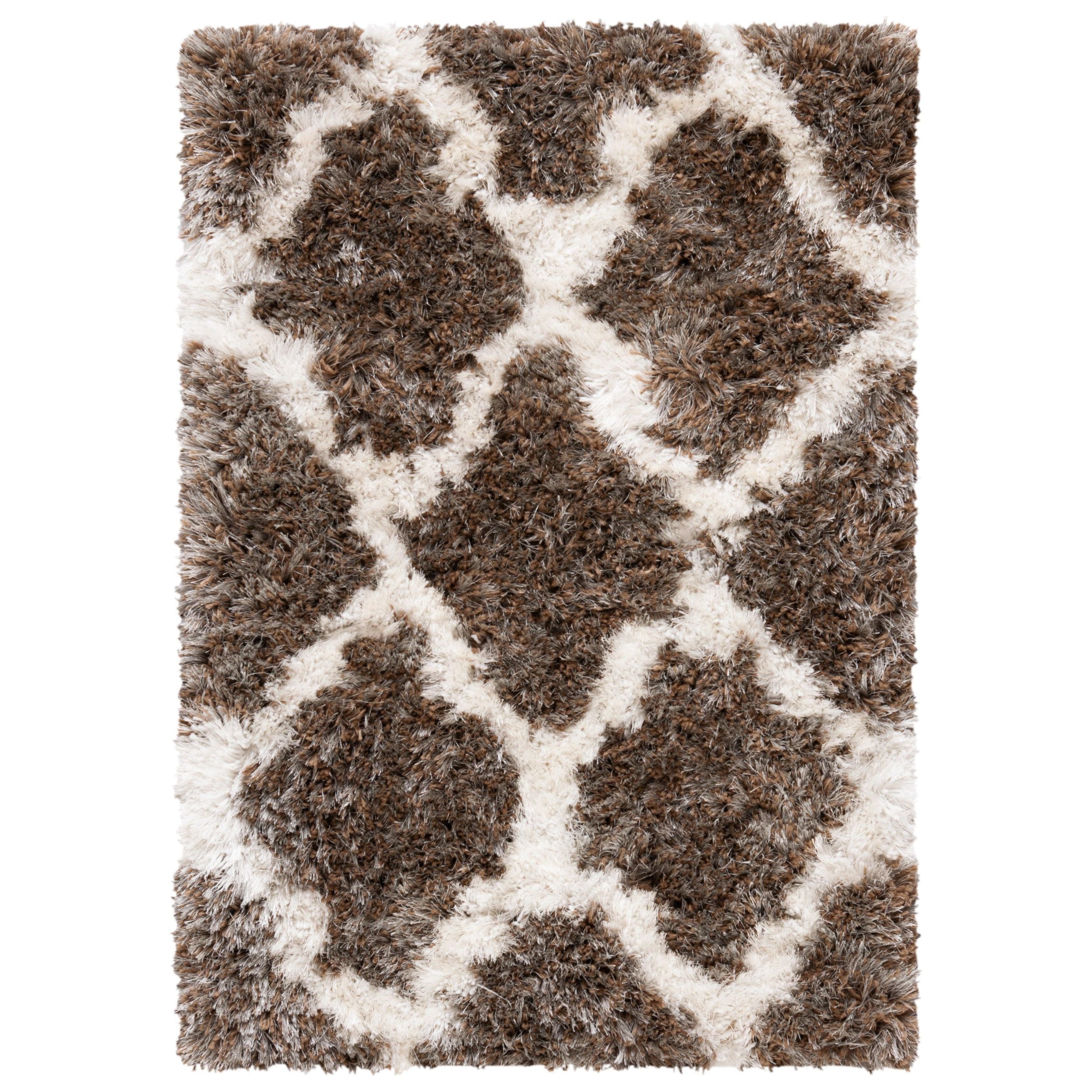 Barcelona Shag BSGB319B from SAFAVIEH, a luxurious addition to your home décor. This collection combines plush textures with traditional designs, featuring a soft ivory pile adorned with silver quatrefoils for a sophisticated touch. Hand-tufted using a blend of dense and subtle synthetic fibers, this rug offers easy maintenance and a lush dimensional look that will endure over time, measuring approximately 1.75 inches thick.