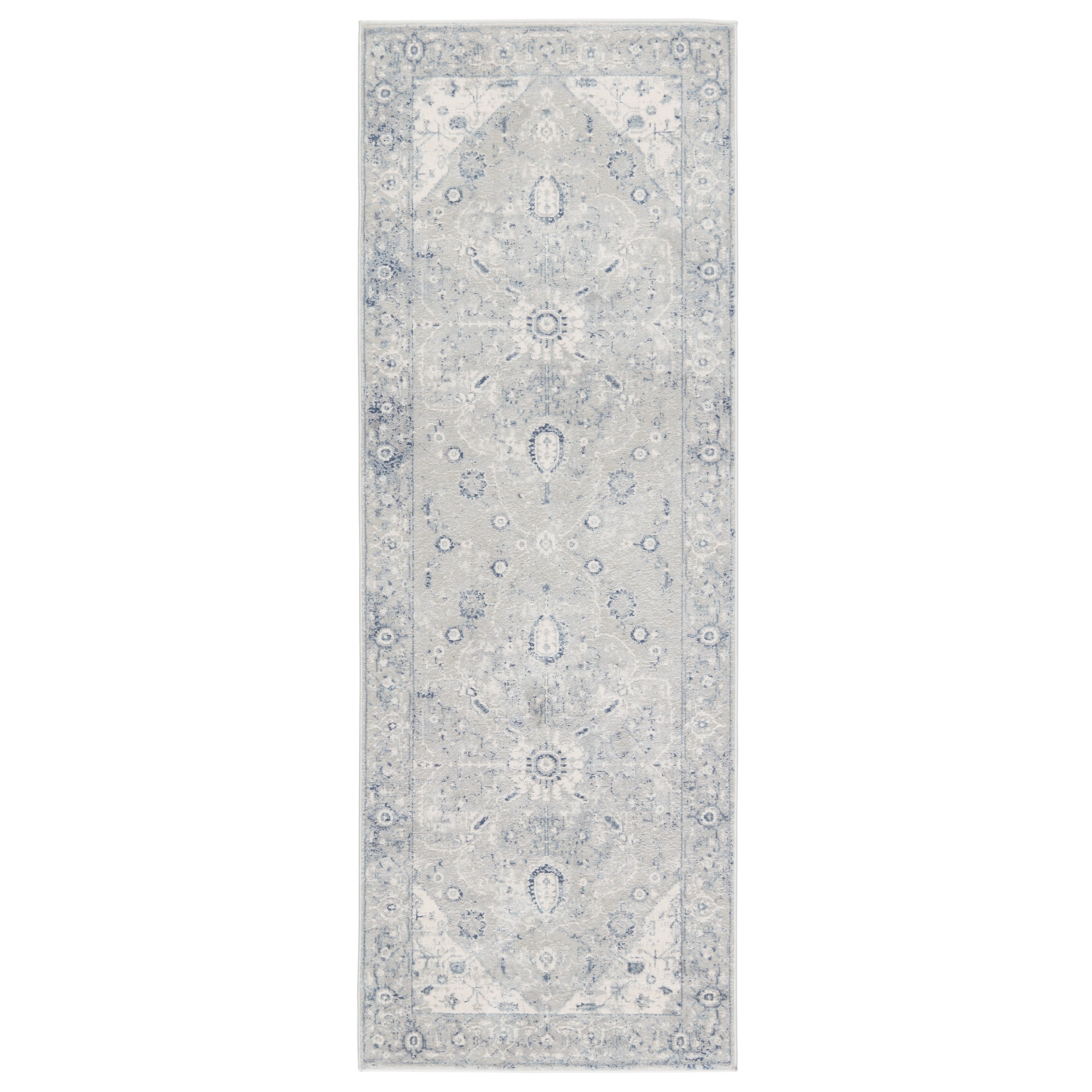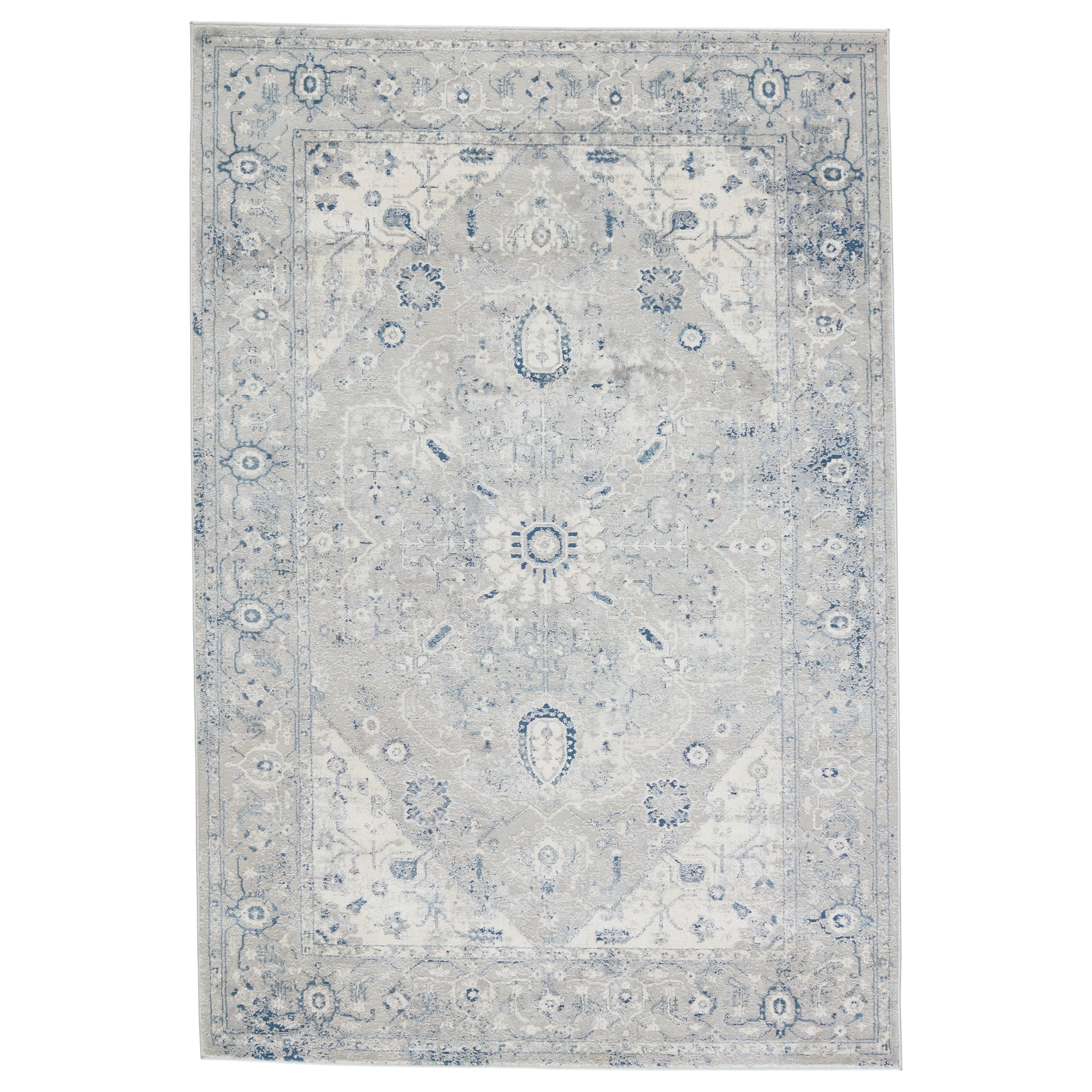 Solace SOC02 Dianella area rug, a stunning addition to any living space. This collection draws inspiration from classic and modern styles, blending them seamlessly into transitional designs. The Dianella rug is adorned with a beautiful center medallion featuring intricate floral patterns in soothing shades of gray, ivory, and light blue.