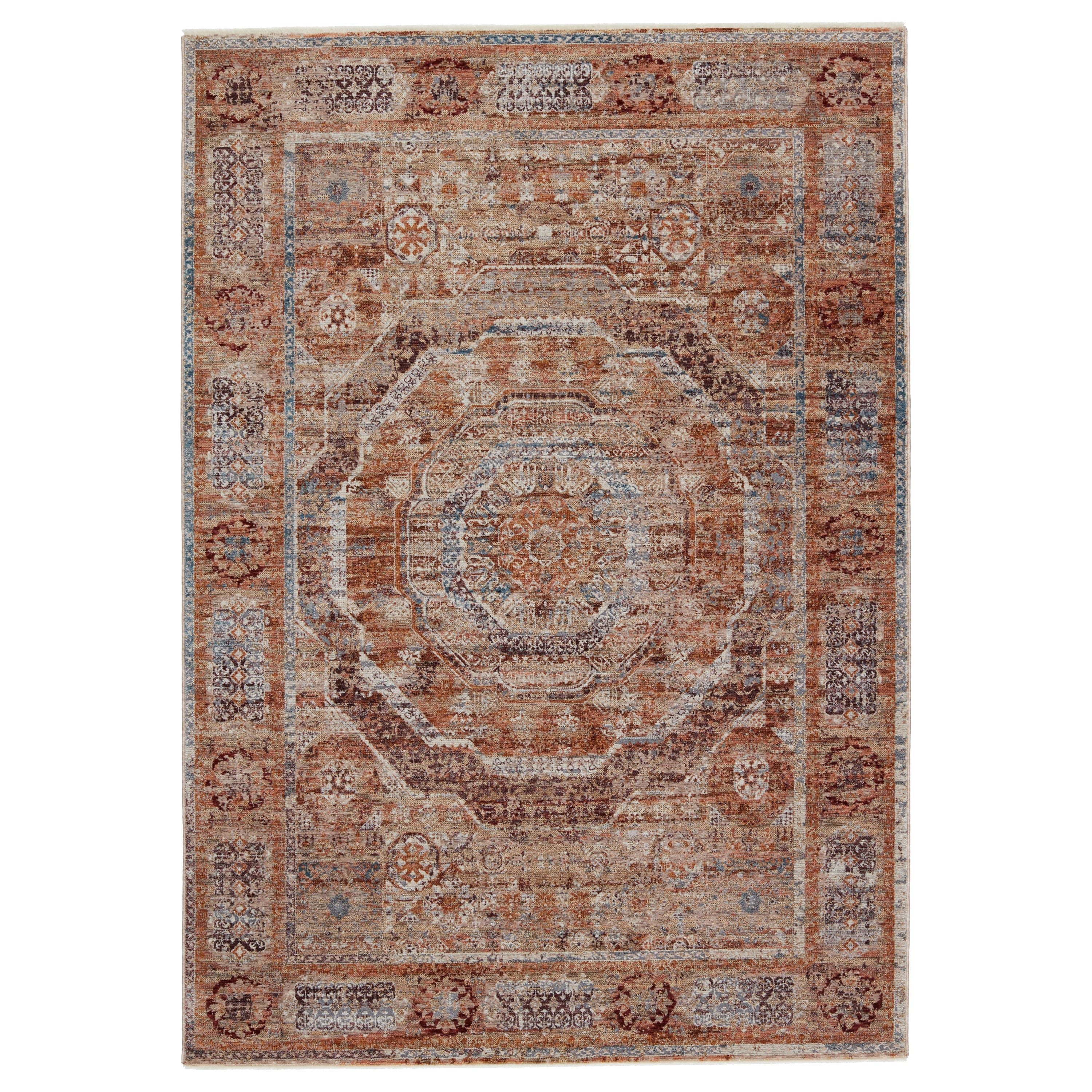Elevate your living space with the exquisite Valentia VLN15 Arcadia rug. This stunning piece combines vibrant colorways with a touch of classic elegance, adding a timeless charm to any room. The Arcadia rug showcases a captivating faded medallion design in rich hues of maroon, blue, rust, and gold.