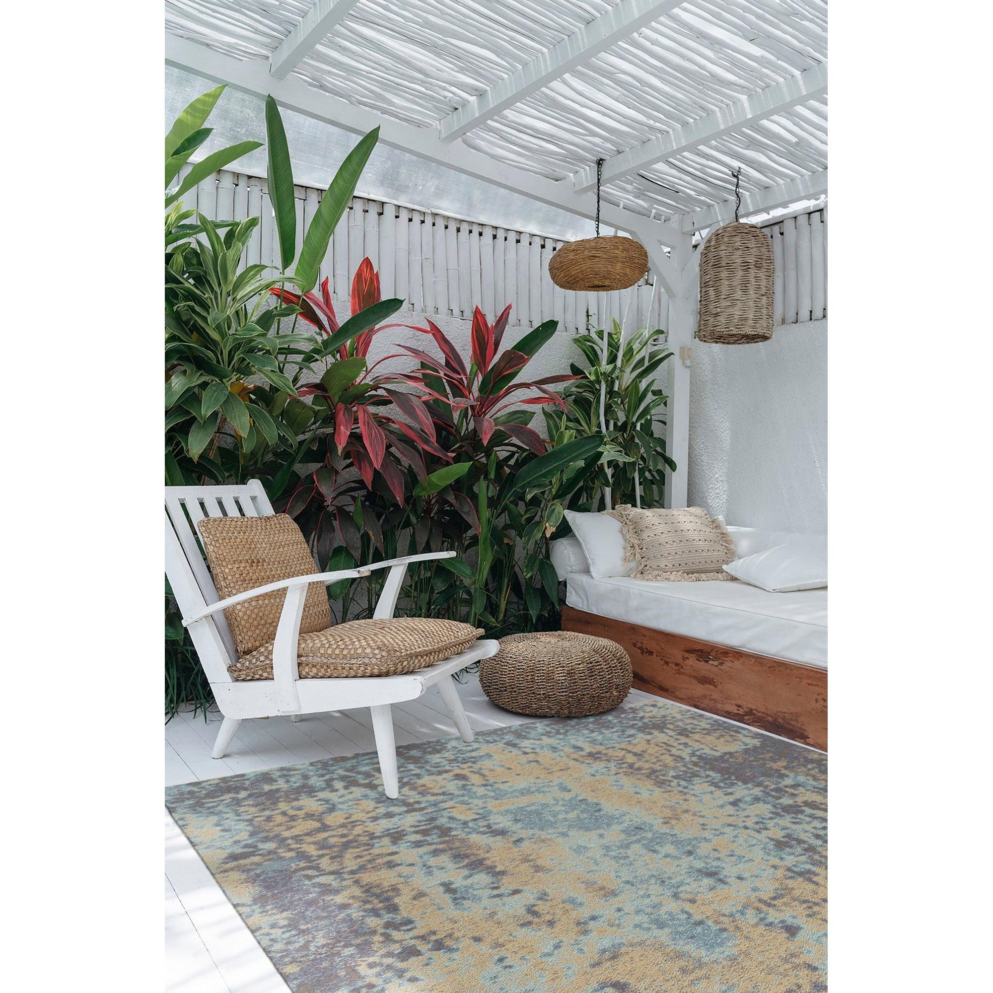 Santiago STG95 03 Beige rug from our exclusive collection. The Santiago line features a stunning blend of colors on a neutral background, inspired by Tibetan shapes and symbols. These rugs are like modern art pieces that effortlessly add sophistication to any indoor or outdoor setting.