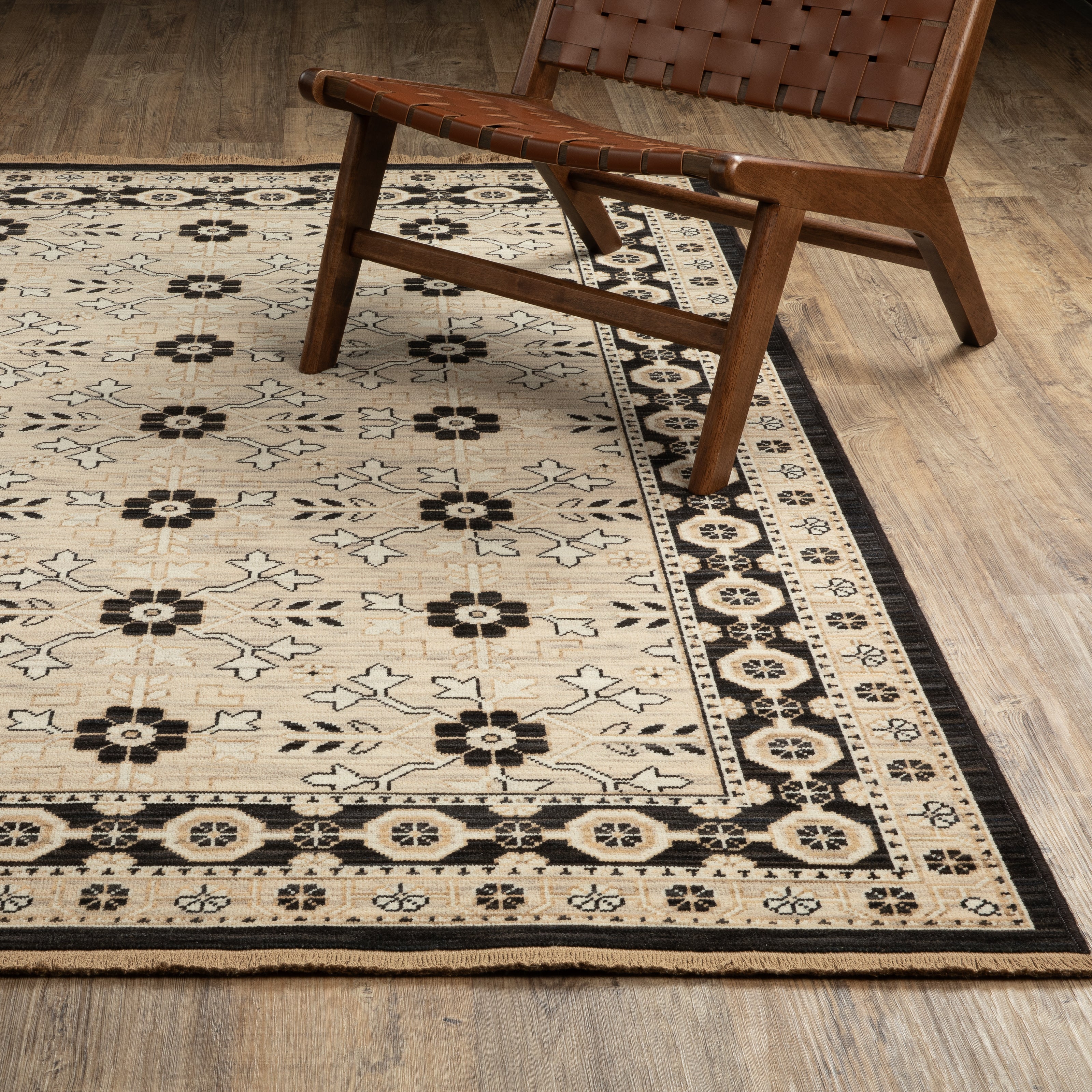 The classically styled Acacia collection features earthy, neutral tones of saturated brown, warm birch and muted gold which are subtly accented with touches of slate blue, soft clay, and moss green. The space-dyed wool and nylon blend is woven in Egypt on an Axminster loom and features incorporated cotton fringe.