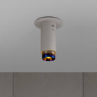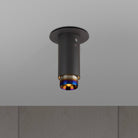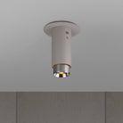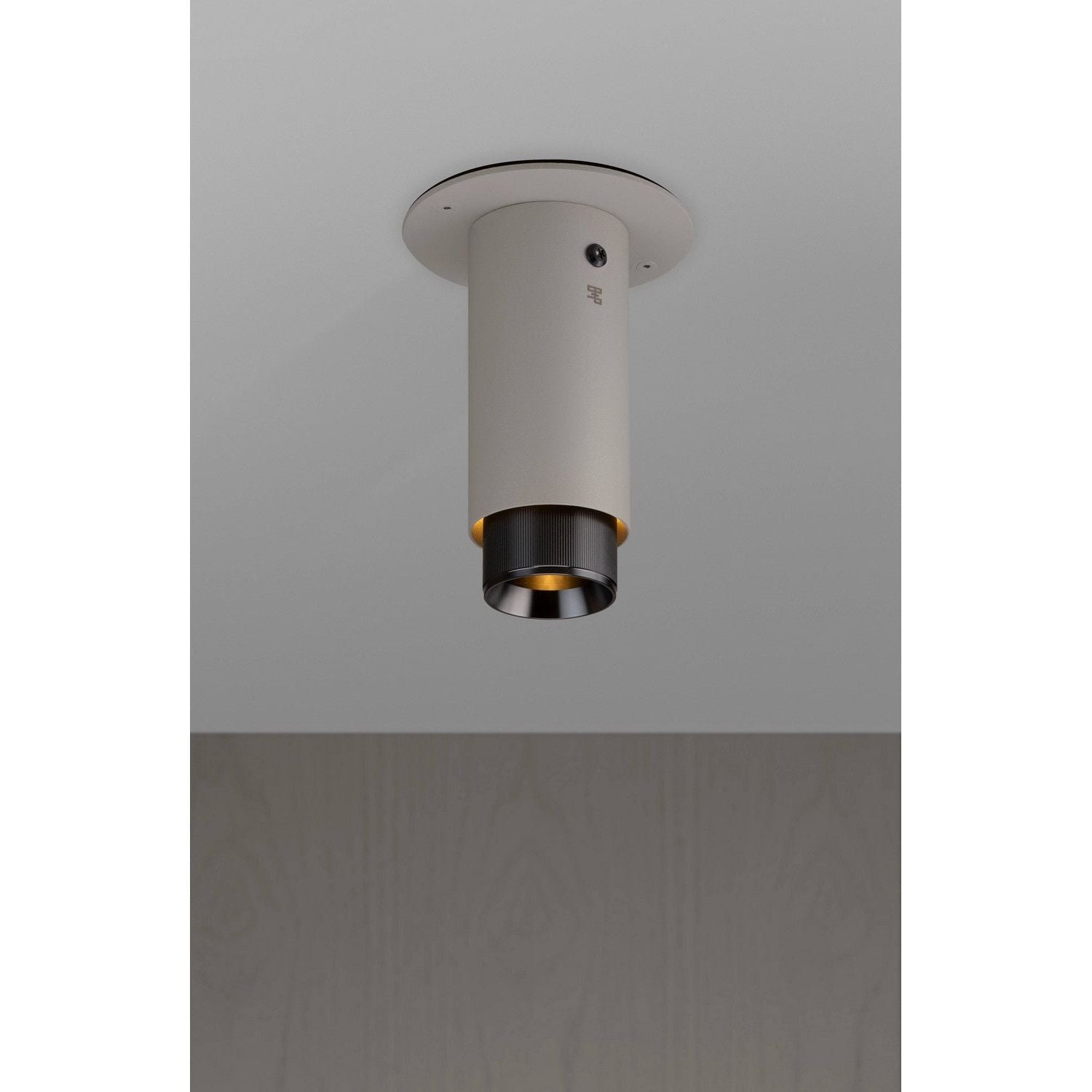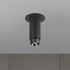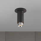 A surface mounted, fixed spotlight made from graphite powder coated metal with linear-knurled solid metal detailing.